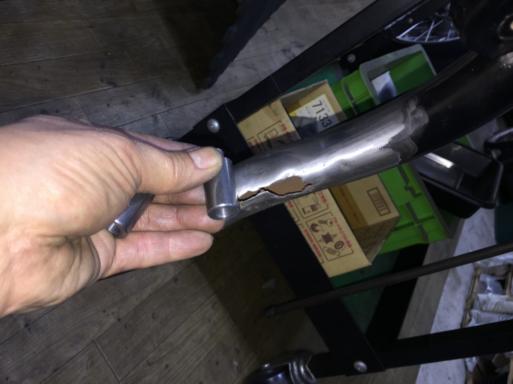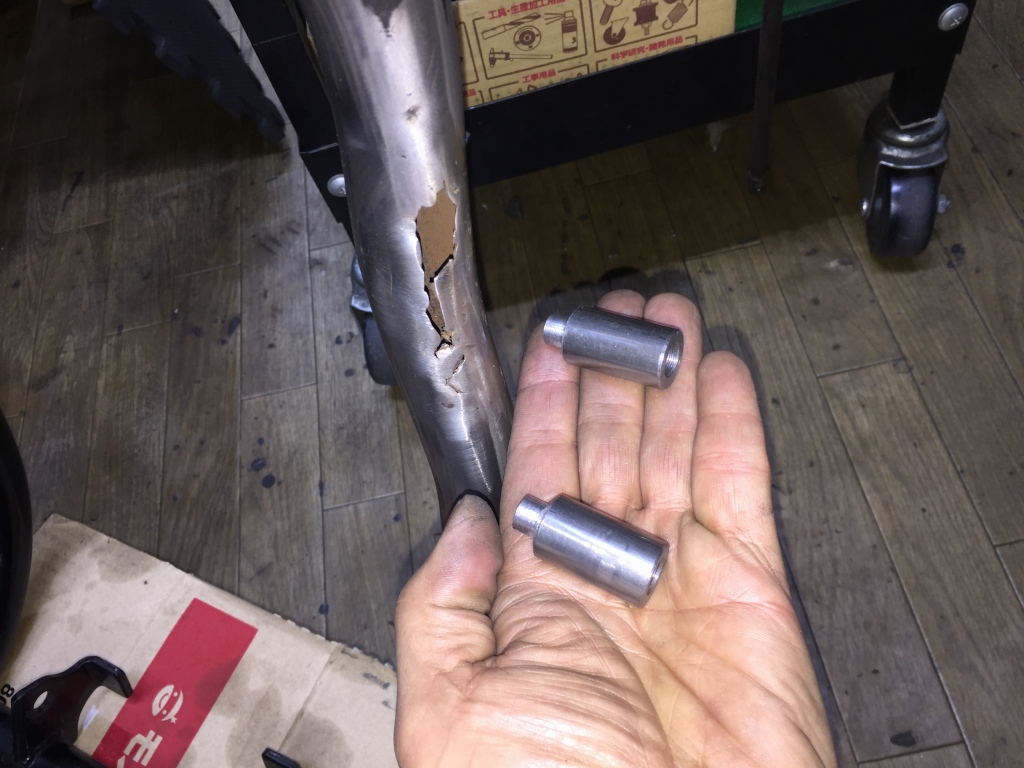こちらは脱着式サイドスタンド取付用のボスです。フレームの穴の開いた側には、半割れのパイプ材を被せて補強する予定。