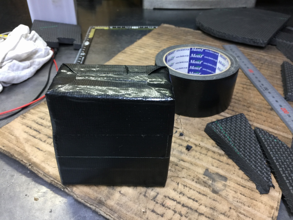 充電したというバッテリーは電圧が低く、2年使っているので新品交換します。今回は少し小型のMFバッテリーを使い、隙間にはスポンジで作ったスペーサーを入れます。