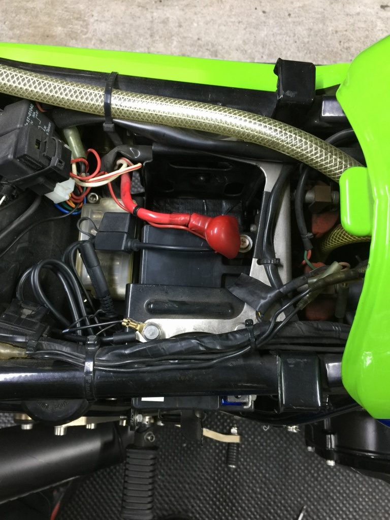 バッテリーは14L-A2タイプのMFバッテリーを使用。奥にスペーサーを入れています。