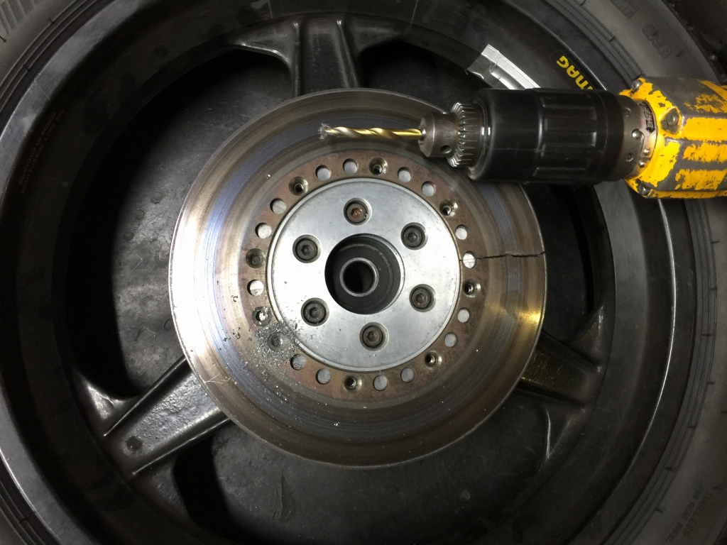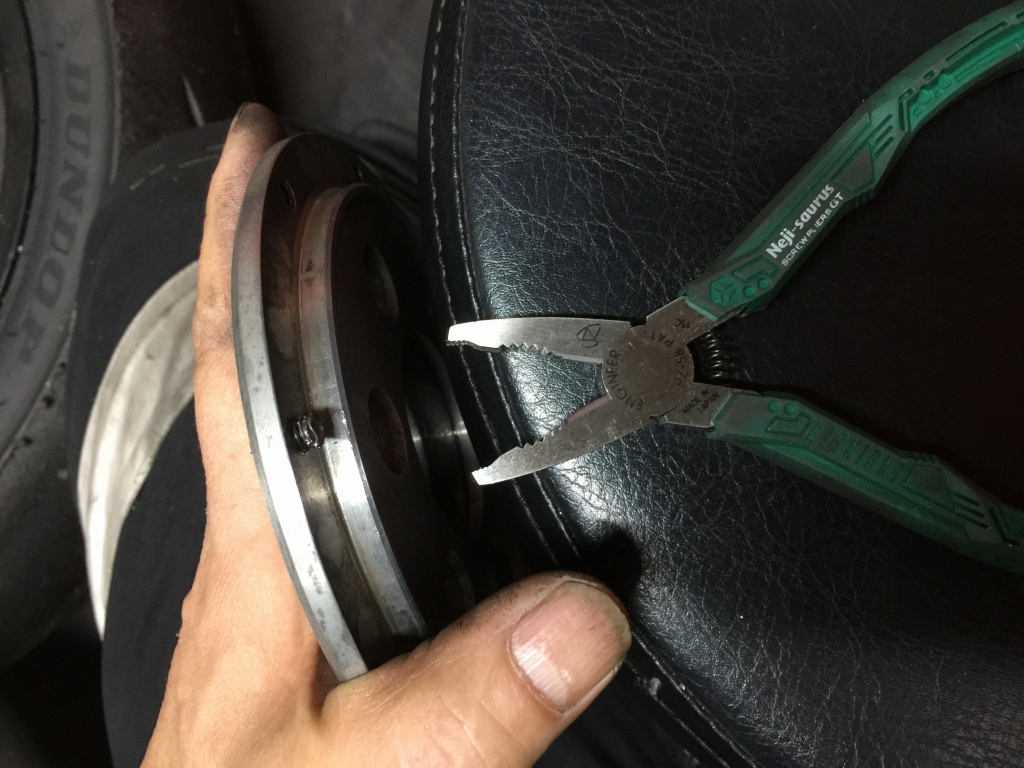 ローターを外しますが、皿キャップボルトが1本固着して緩まないのでドリルで揉んで外します。