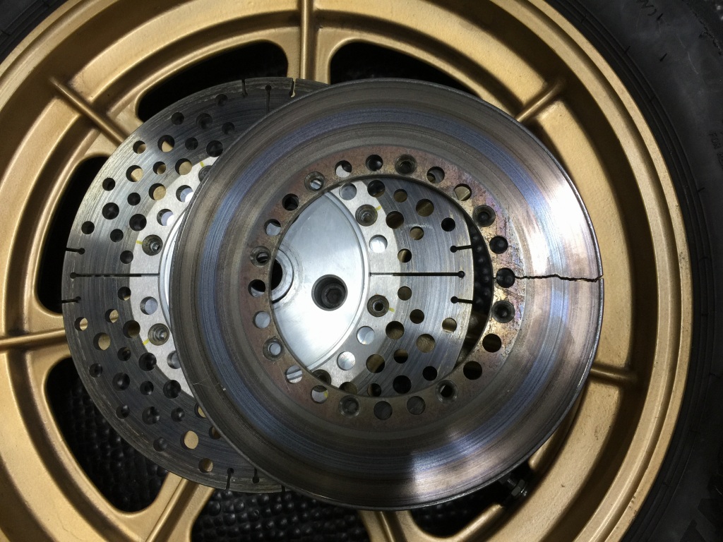 外したクラックの入ったローターはこちら。ボルトの締め付けが外れると、解放されてクラックが更に広がっています。