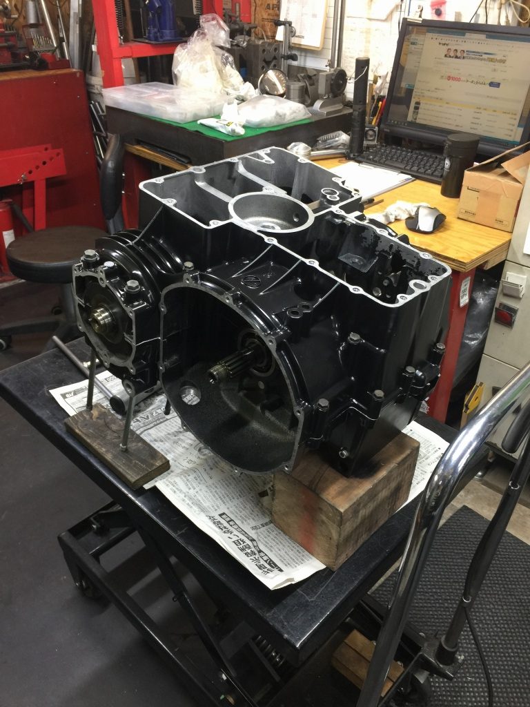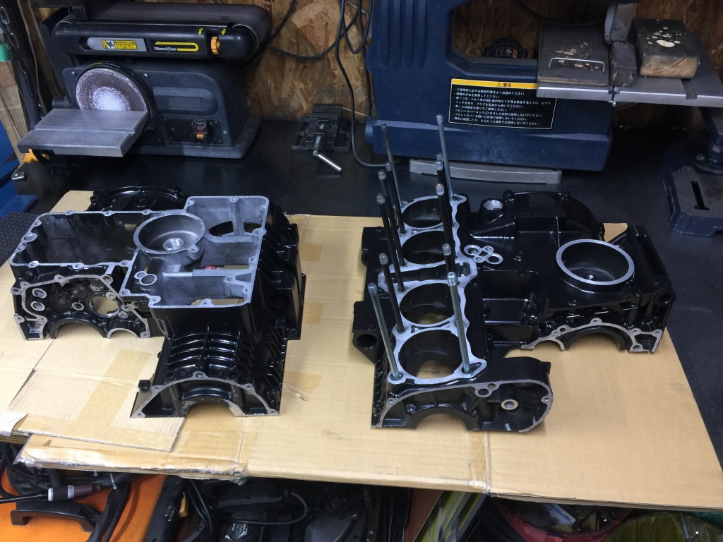 エンジンの塗装が完成しました。クランクケースなどの半ツヤ部分はセラコートで、カバー類の黒ツヤ部分はウレタン塗装しています。