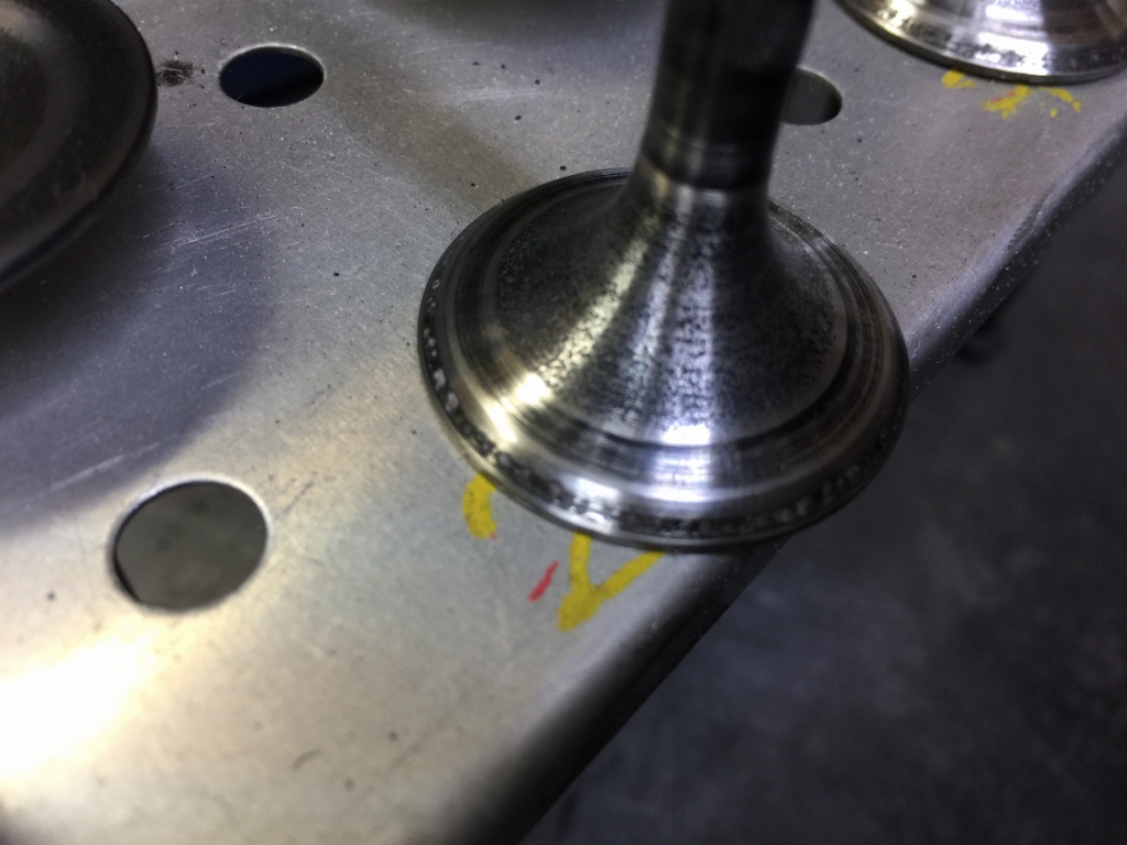 エキゾーストバルブは、カーボンの噛みこみ痕が無数に有り、バルブフェースは凹みが多く、このまま擦り合わせしても消えないので新品交換することに。