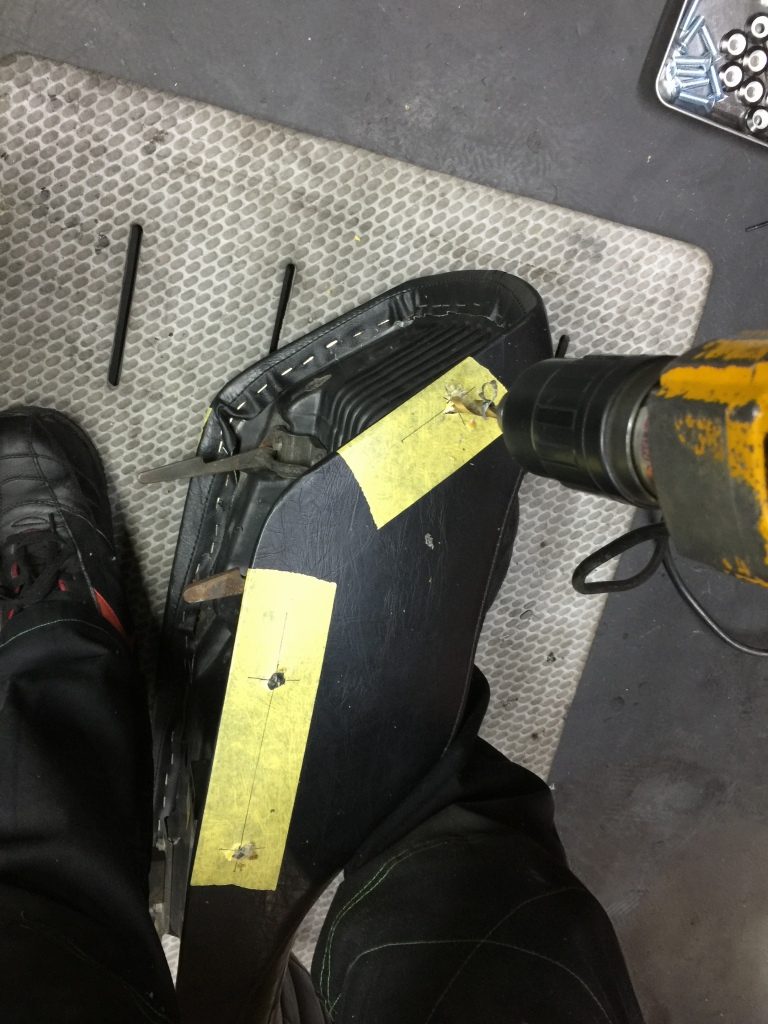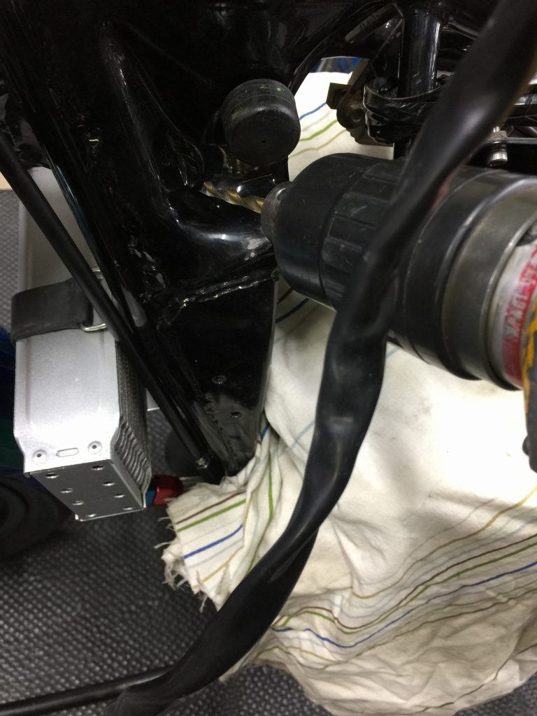 続いてホーンを設置します。スタイル上、外から見えにくい位置に接しするので、ガセットのこの位置に穴開けします。