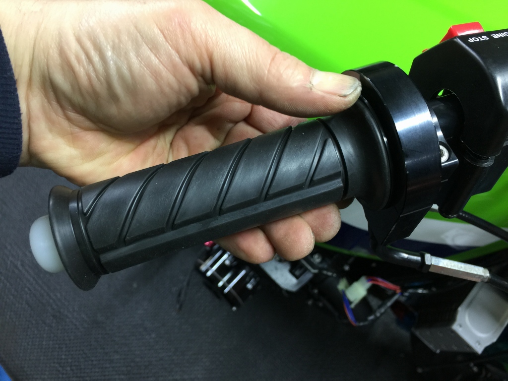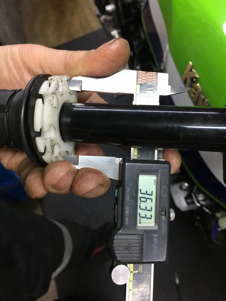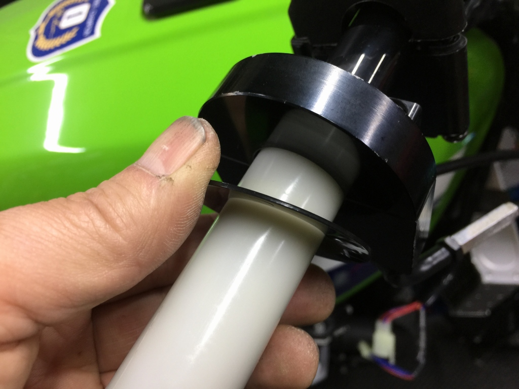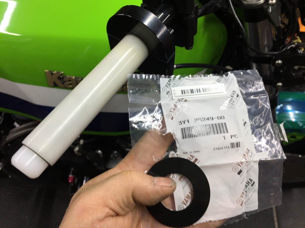 続いてハンドル周り。元のハイスロを付けてグリップは交換します。ハイスロボディーとグリップが擦れるので、滑りを良くるするため樹脂のワッシャーを入れます。こちらはヤマハの純正部品です。