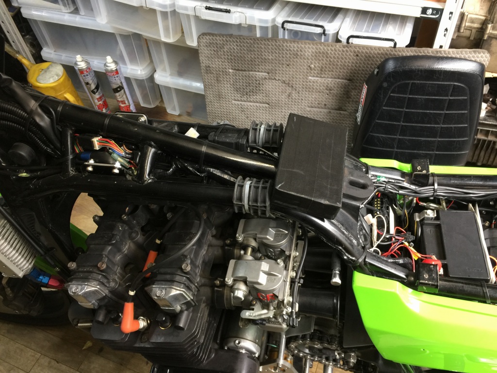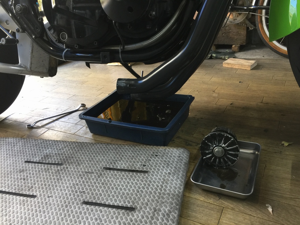 マフラーの後半を集合部から外して、エキパイを左右に開けばフィルターまで外せます。