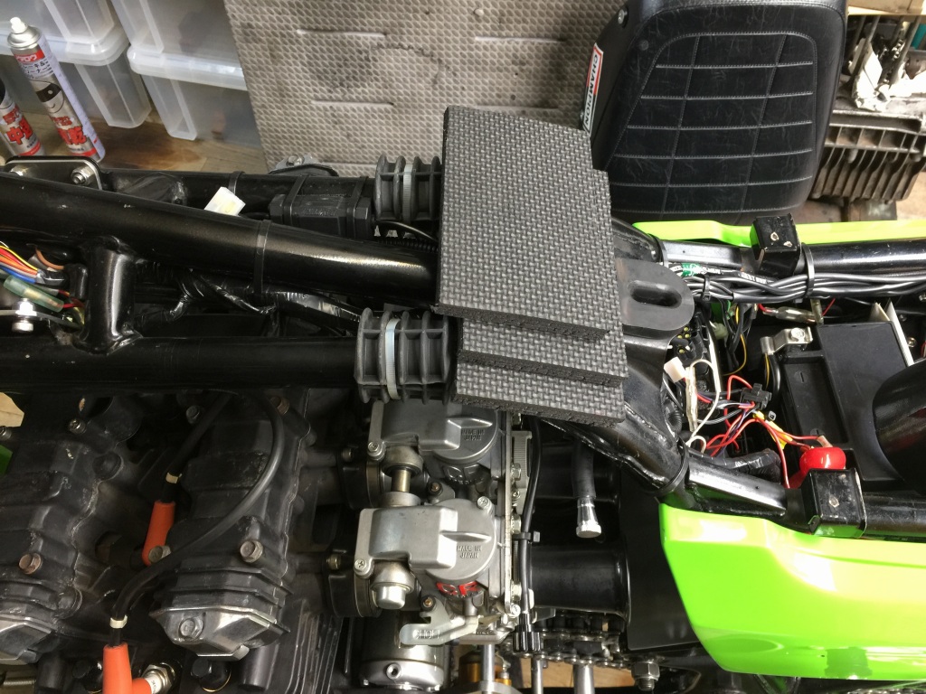 タンクを更に持ち上げたとのこと、後ろのダンパー部分を重ねて持ち上げただけでは、マウント部分に負担がかかるので、スポンジのスペーサーを追加してタンクの重量を支えるようにします。