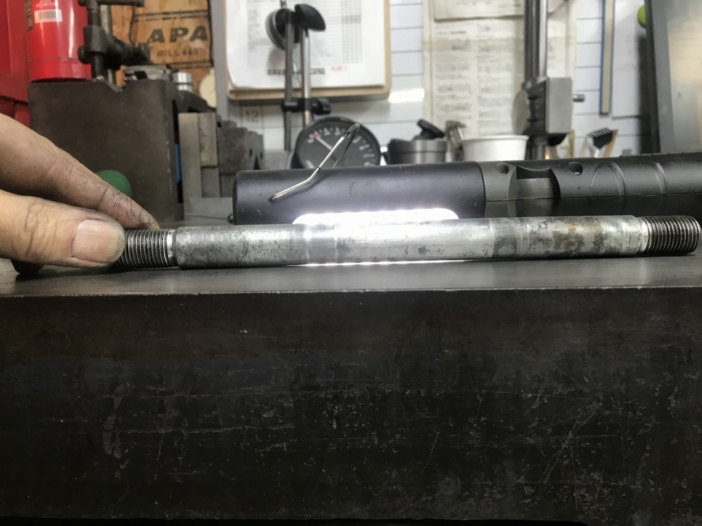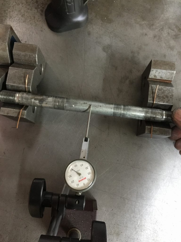 アクスルシャフトにも曲がりを発見。振れで約0.4ミリあります。