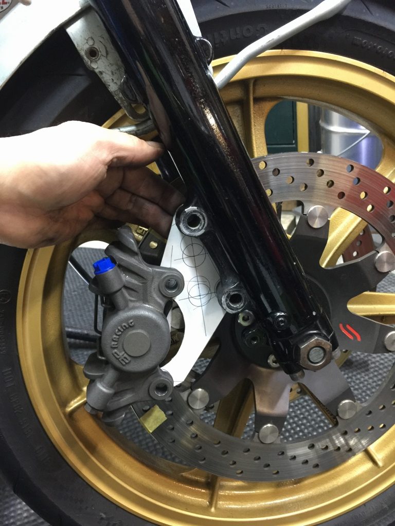 キャリパーサポートは現車合わせで設計します。先ず、ローター外周にキャリパーのクリアランスを取るためのワイヤーを貼り付けます。