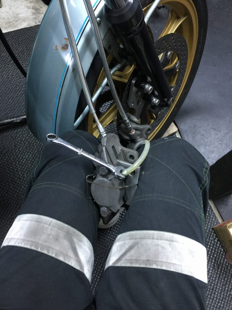ホースをキャリパーに取り付けたら、キャリパーを一旦外してエア抜きします。先ずはバキューム。