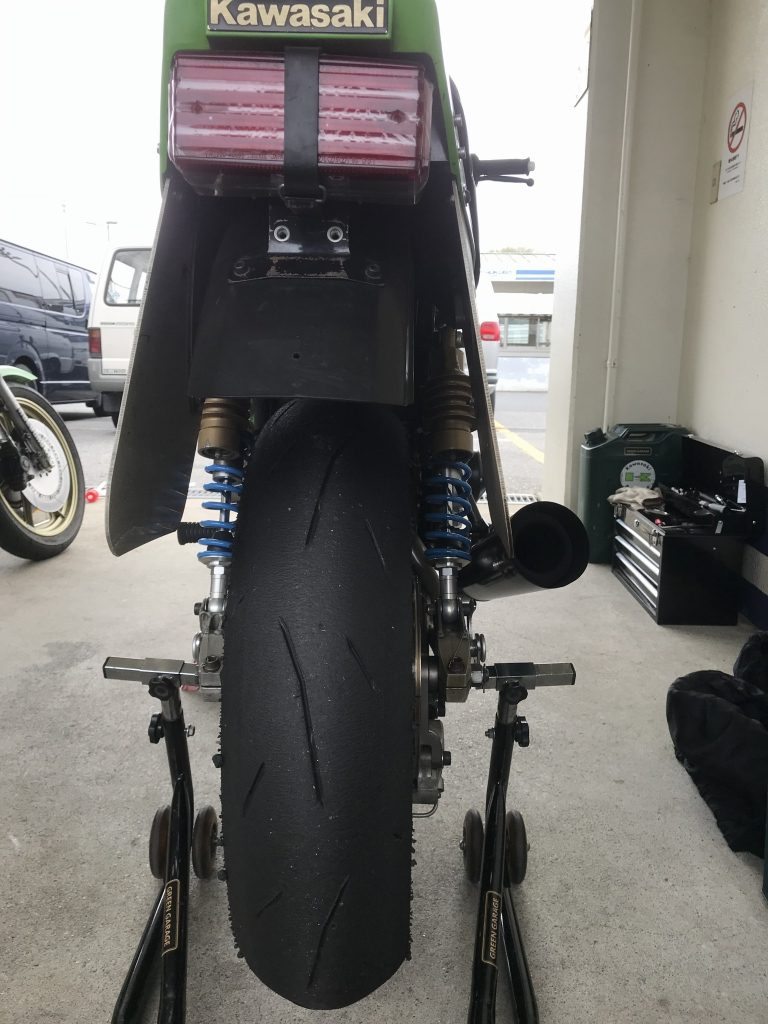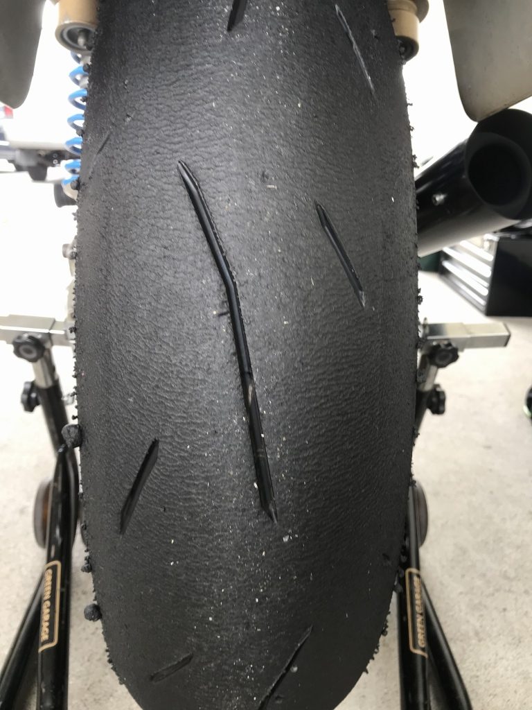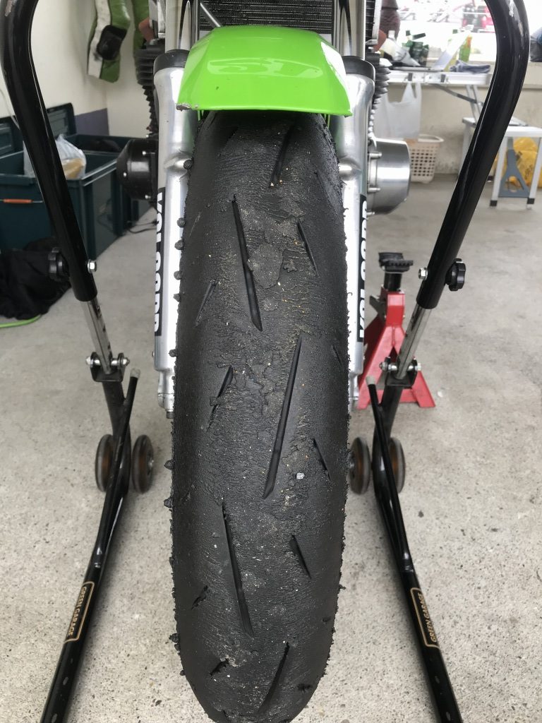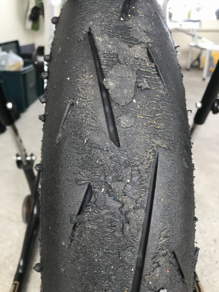 フロントタイヤはα13SPです。路面のタイヤカスを拾うことが多く、トレッドセンターは凸凹です。