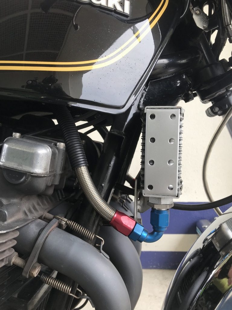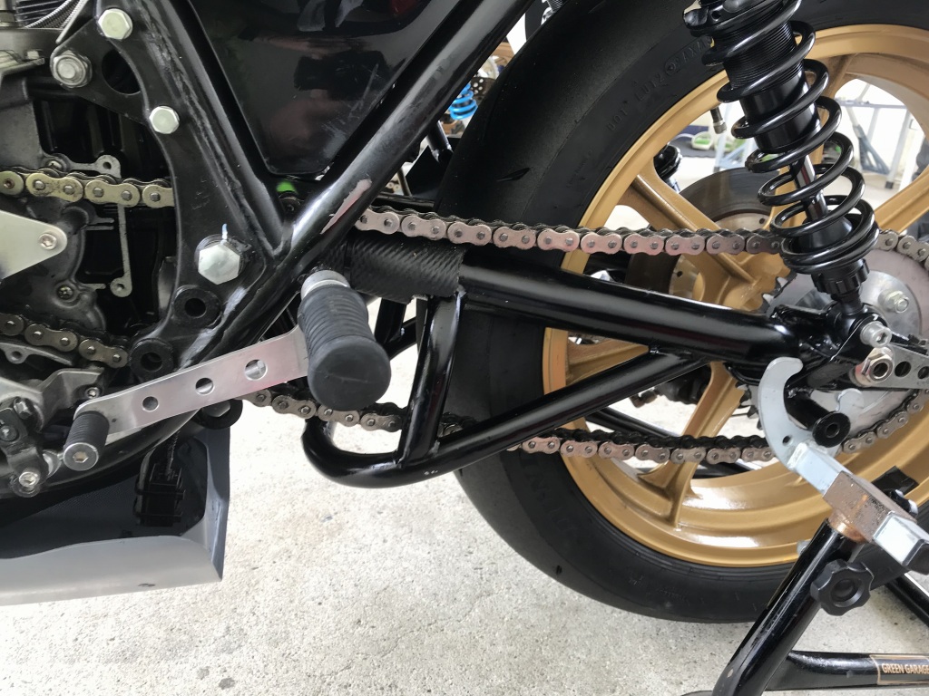 サイレンサーのステーは、タンデムステップのステーを一部残して合わせたもの。これもワークス車と同じです。