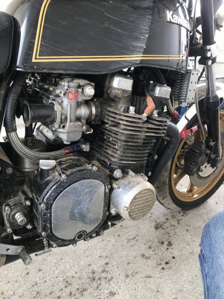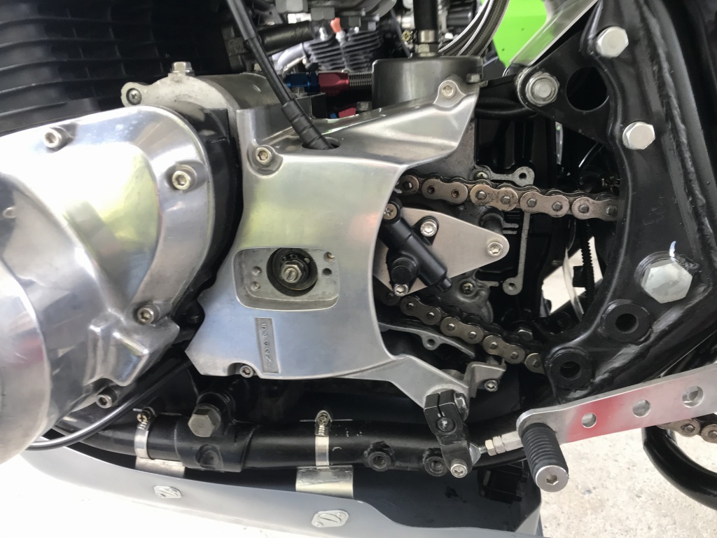スプロケカバーのカットラインもワークス車と同じ。スピードメーターギヤBOXがあるのは、公道も走る街乗り車の証。