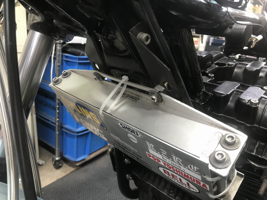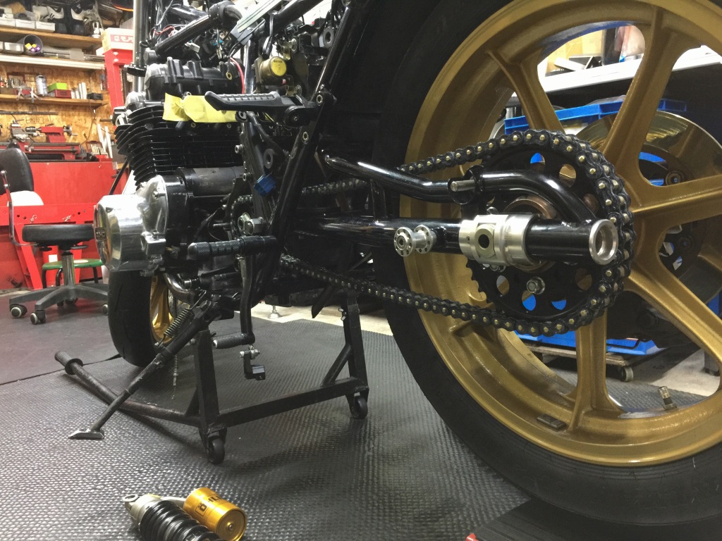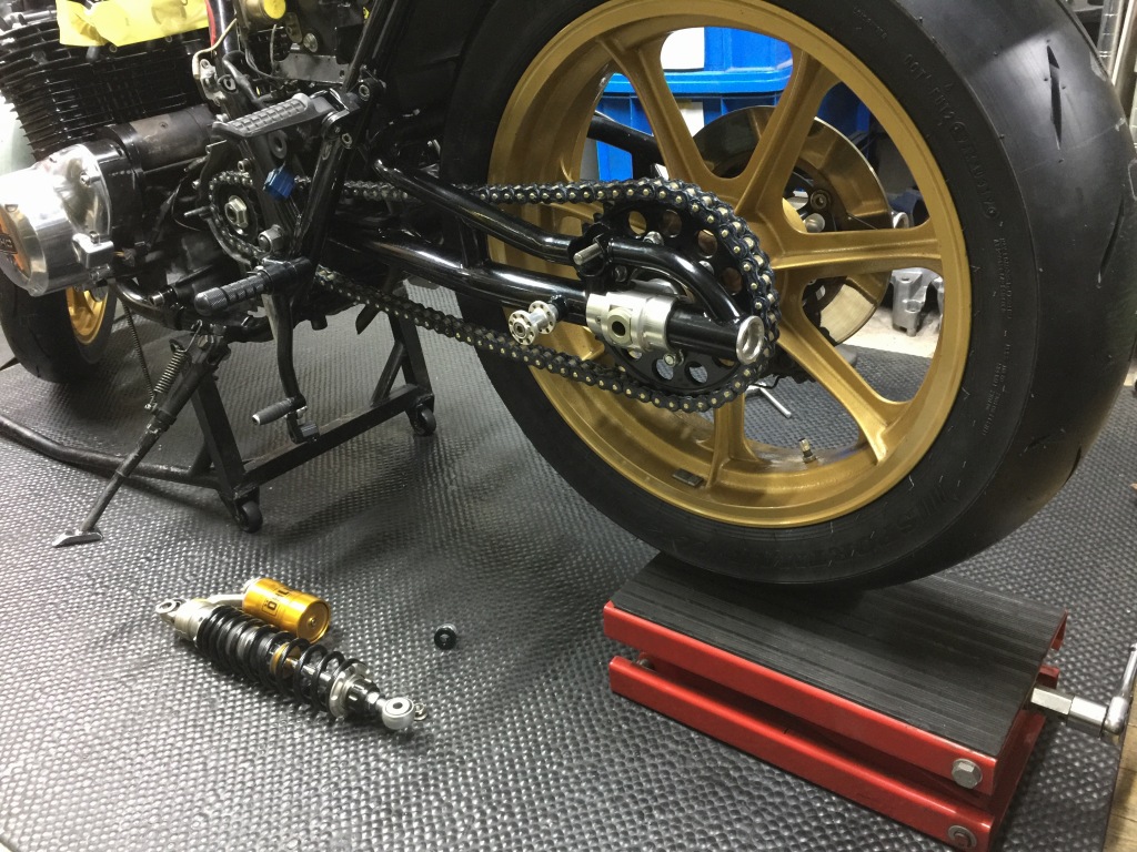 リヤショックを復元します。わりとスイングアームの垂れ角が大きいので、ジャッキアップした状態ではチェーンの振幅は60ミリほどありました。