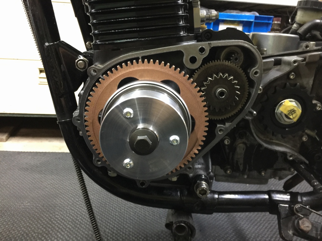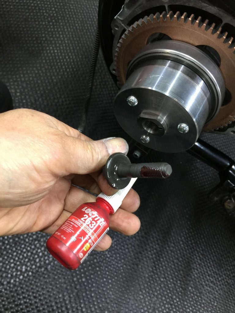 ジェネレーターローターもイギリス製の新品に交換。ボルトにネジロックを塗布して組付けます。