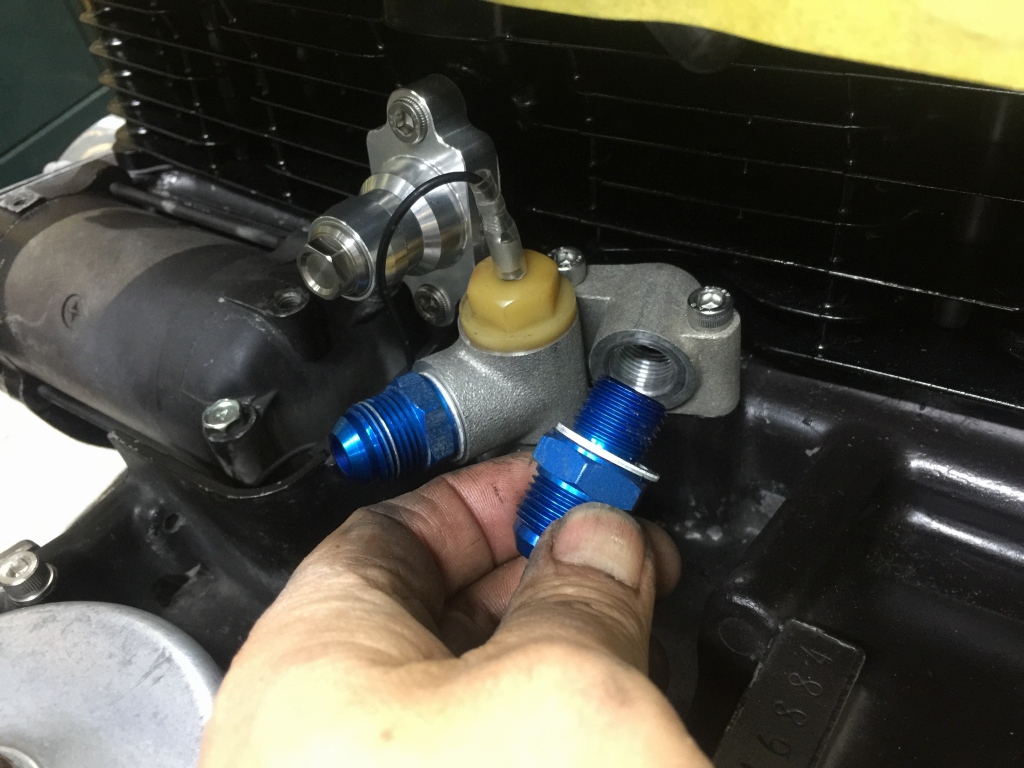 注文していたφ16ミリのワッシャーが入荷したので、オイルラインのニップルを取り付けます。決してシールテープは巻かないでください。