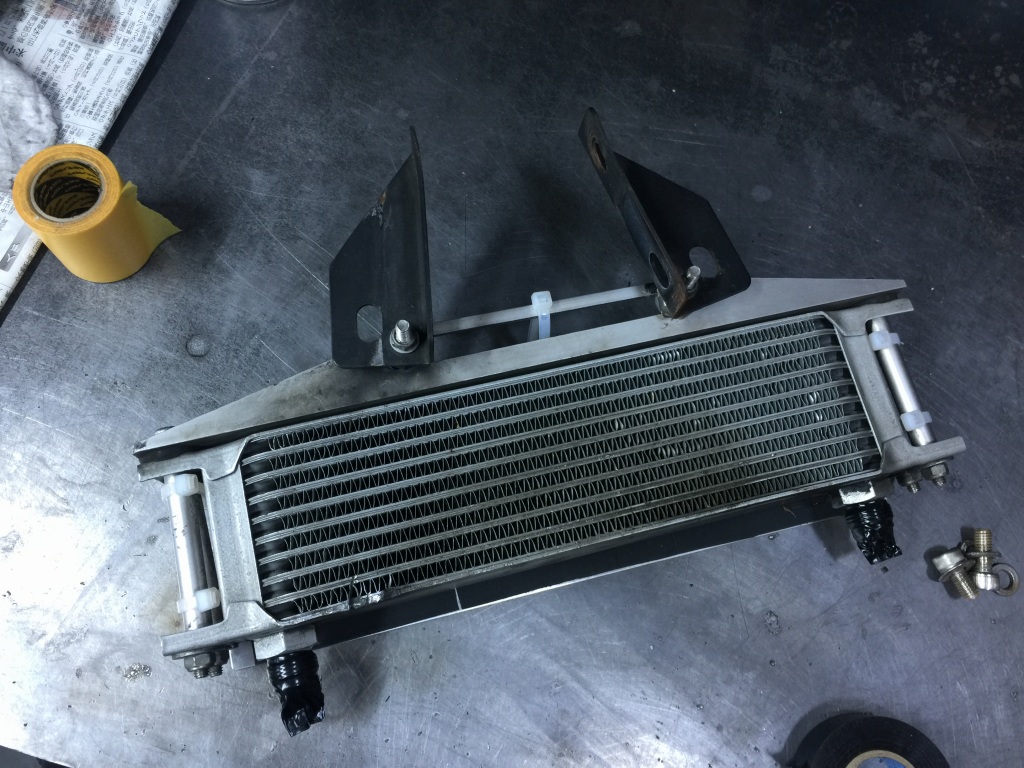オイルクーラーは交換することになりました。今度は9インチ13段コアで、ホースはエンジンの上回しにします。