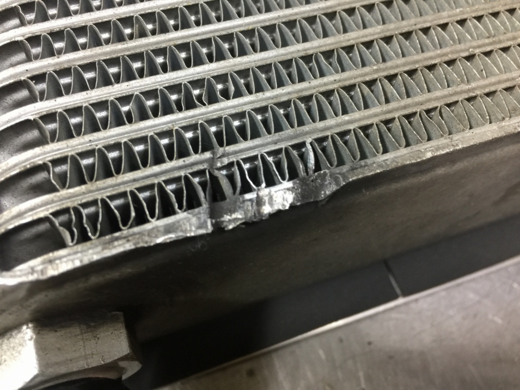 オイルクーラーブラケットをよく見ると、上部のマウント部分にクラックがあります。