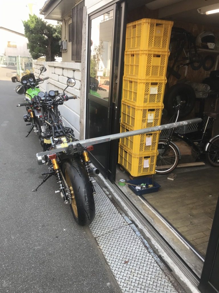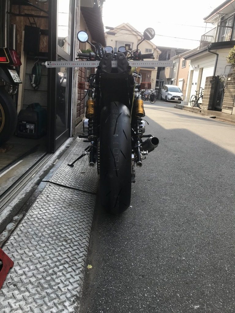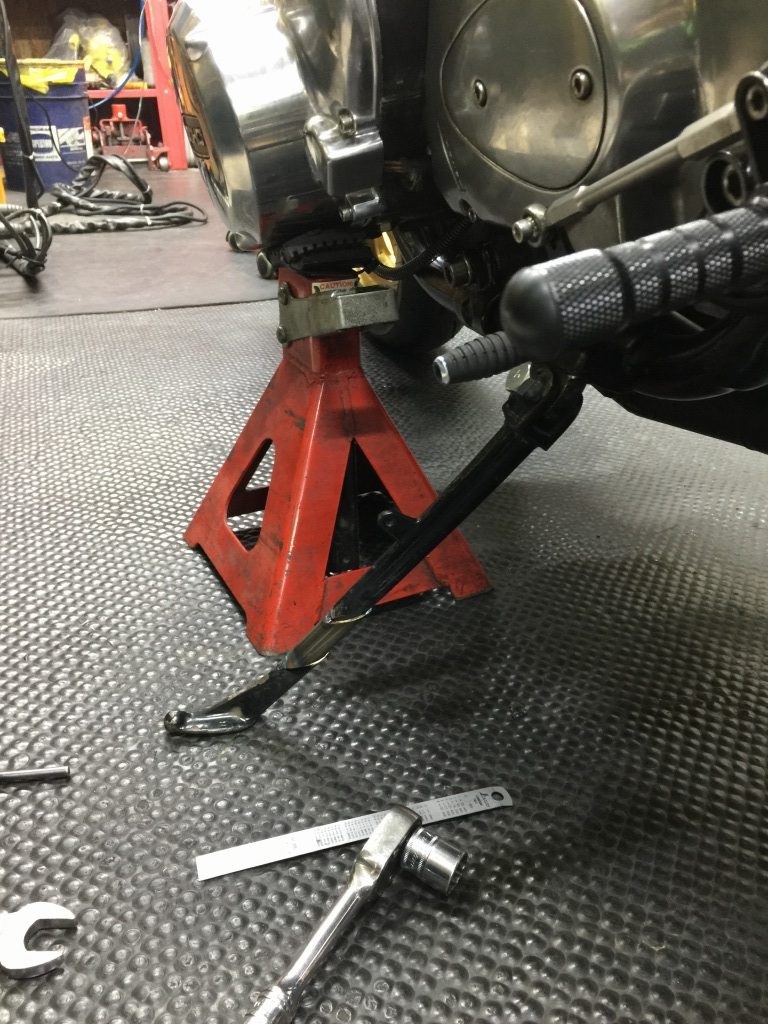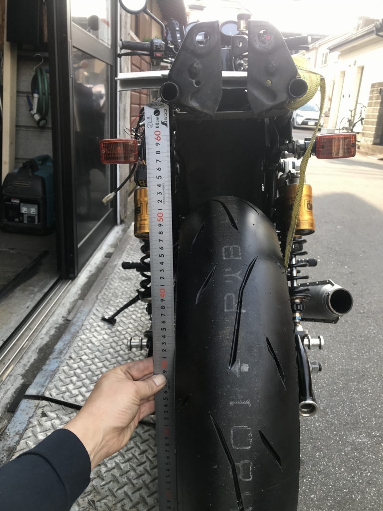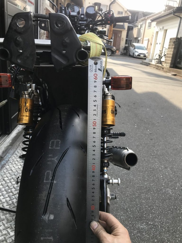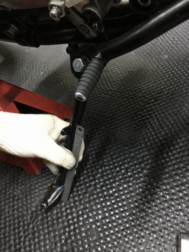 車両をジャッキでいい角度に支え、スタンドの延長長さを検討します。40ミリほど延長すればいいようです。