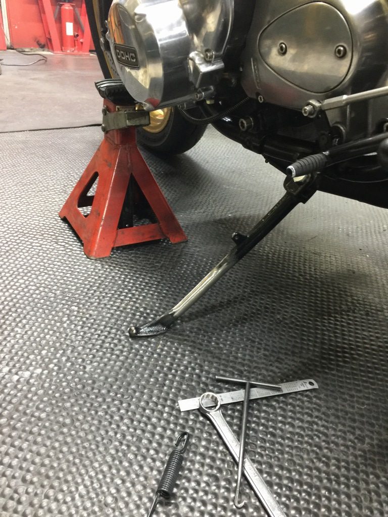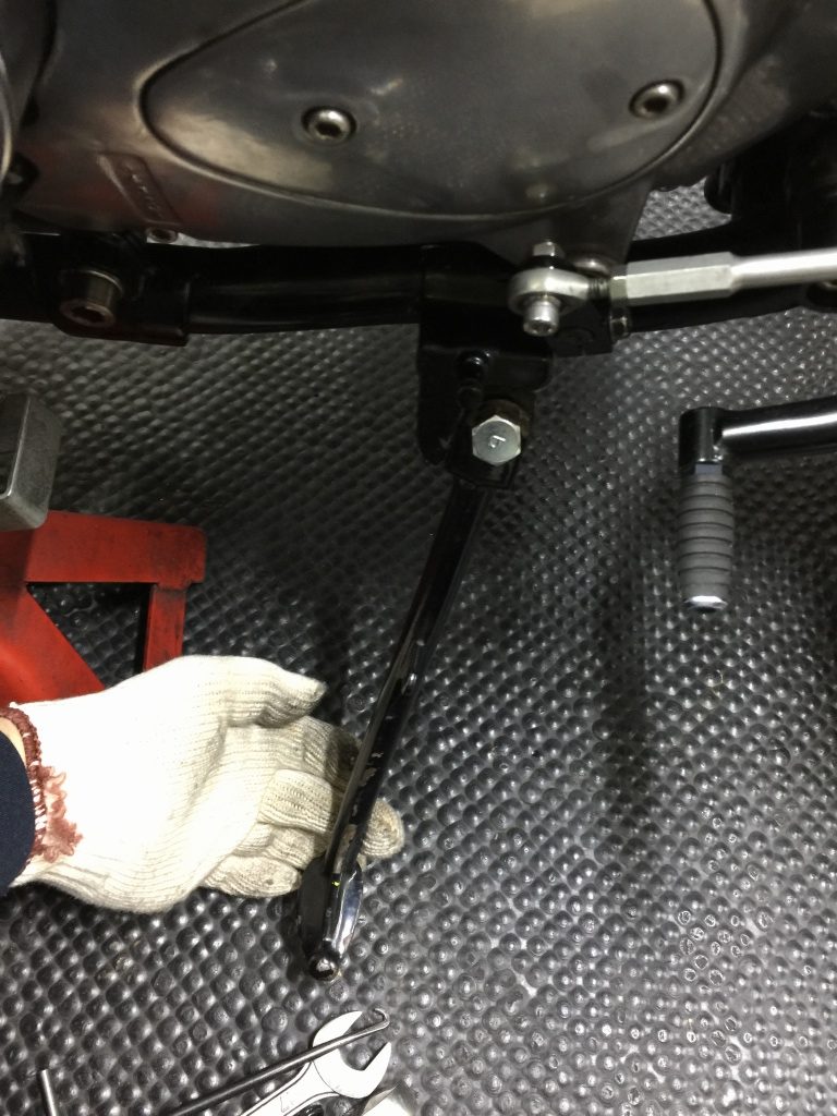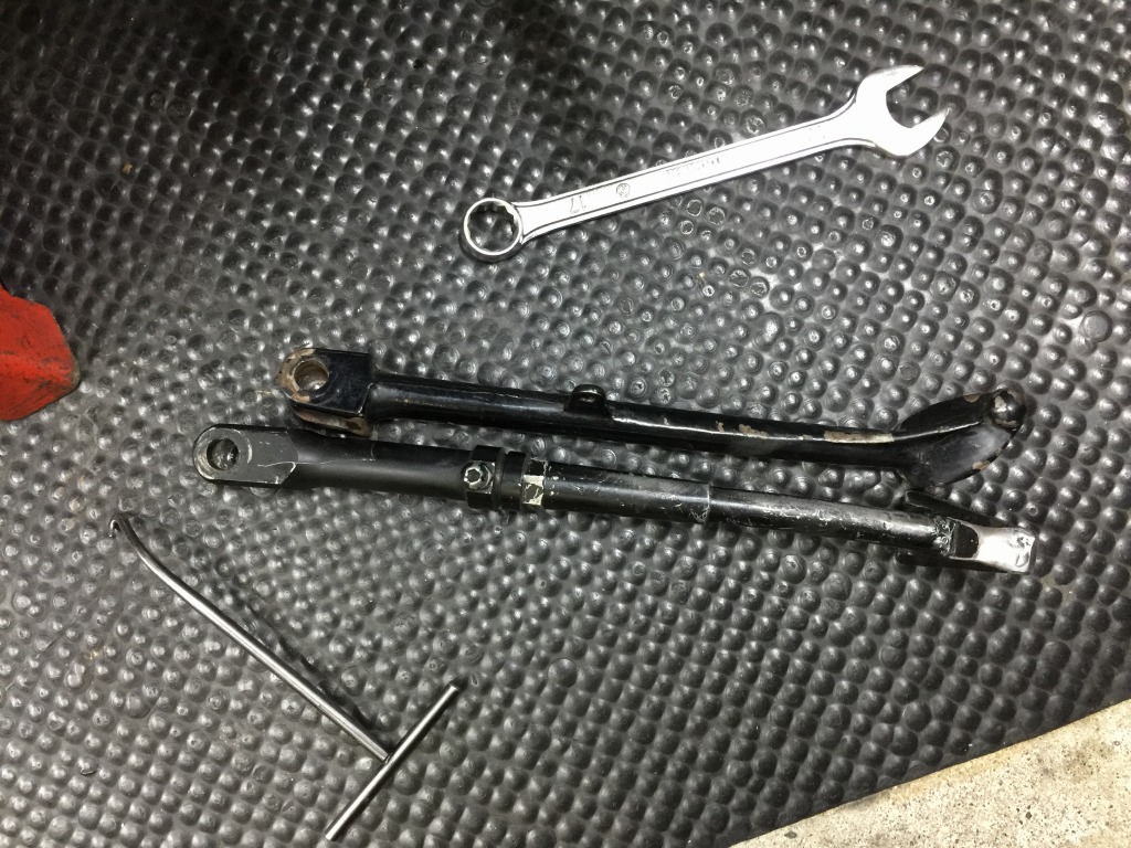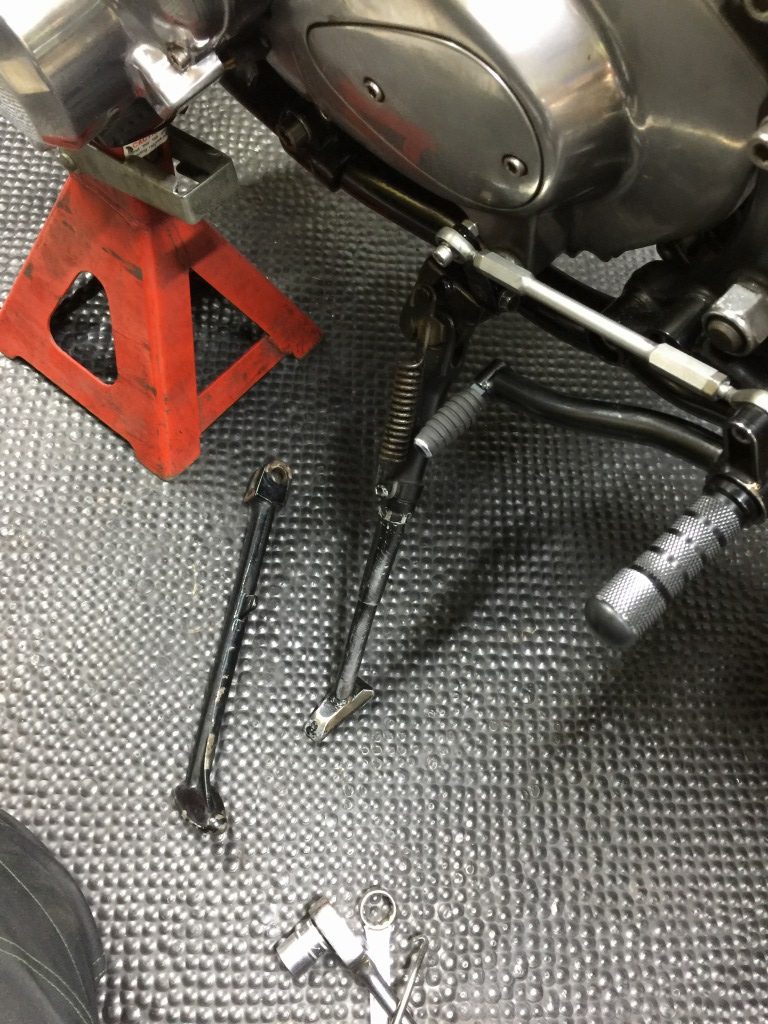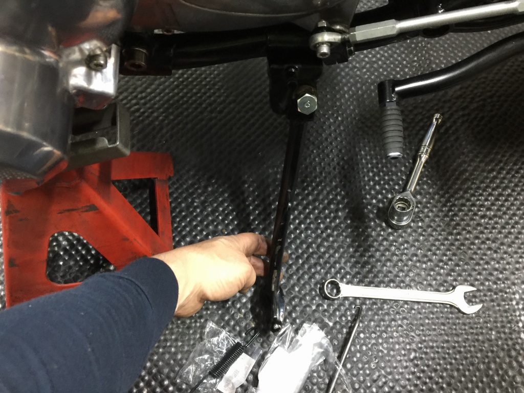 続いてサイドスタンドを変更します。現状は車高の高さに合わせてアジャスタブルタイプが付いていますが、ルックスからノーマルに戻します。