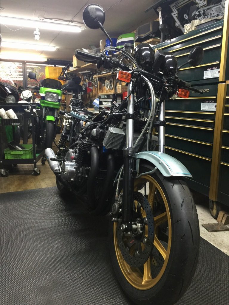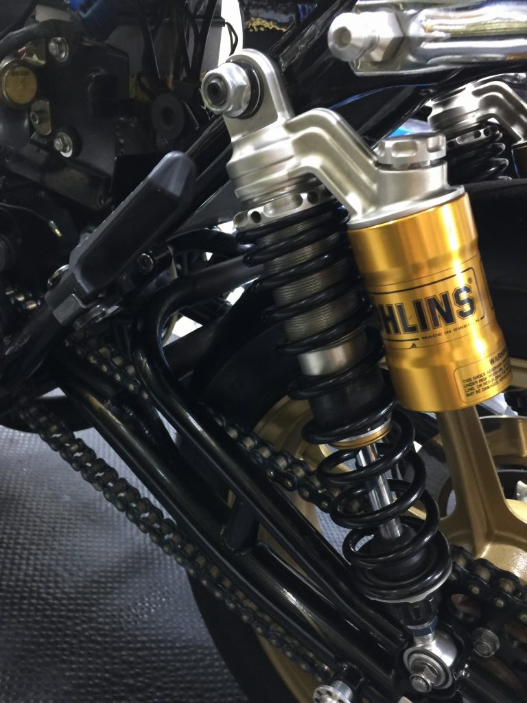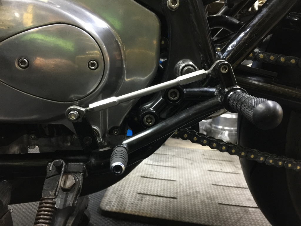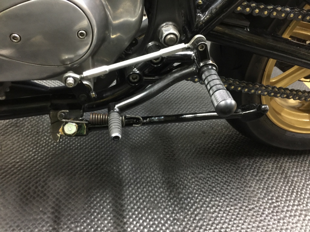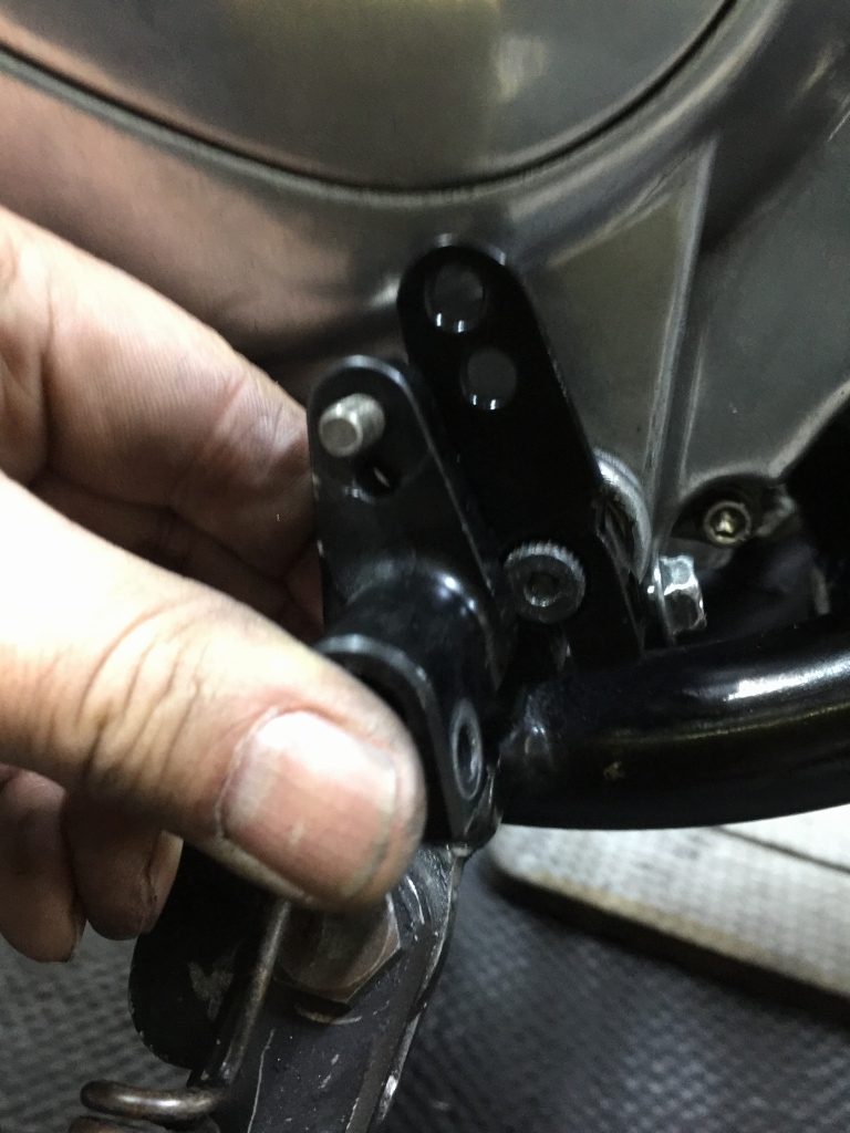 続いてサイドスタンドを変更します。現状は車高の高さに合わせてアジャスタブルタイプが付いていますが、ルックスからノーマルに戻します。