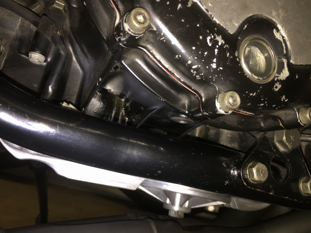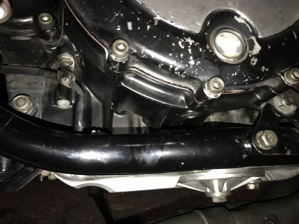 どうやら、オイル漏れは、下から入っているクランクケースボルト穴からのようです。