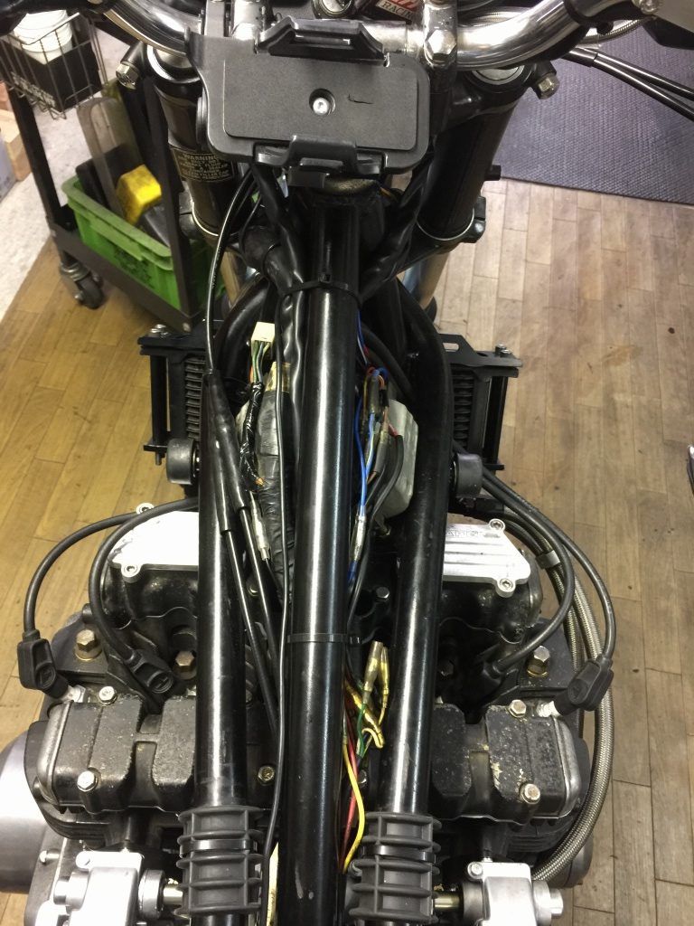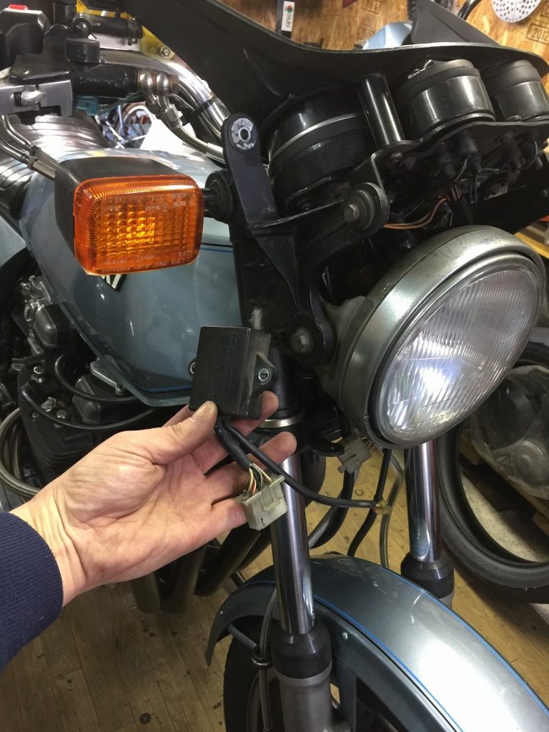 カウルを外し、ライトステー右側にあるウインカーのオートキャンセル用コントロールユニットも外します。
