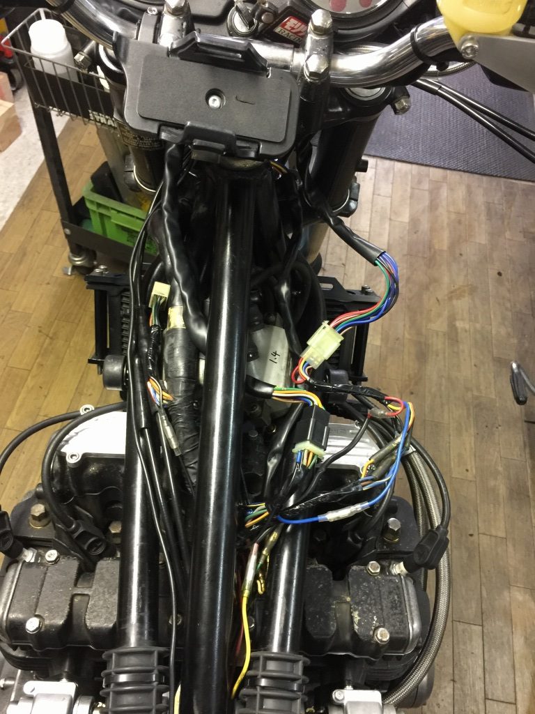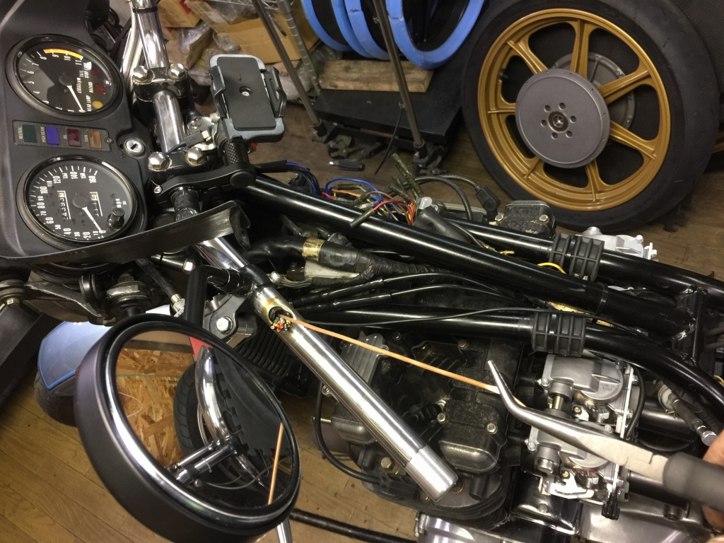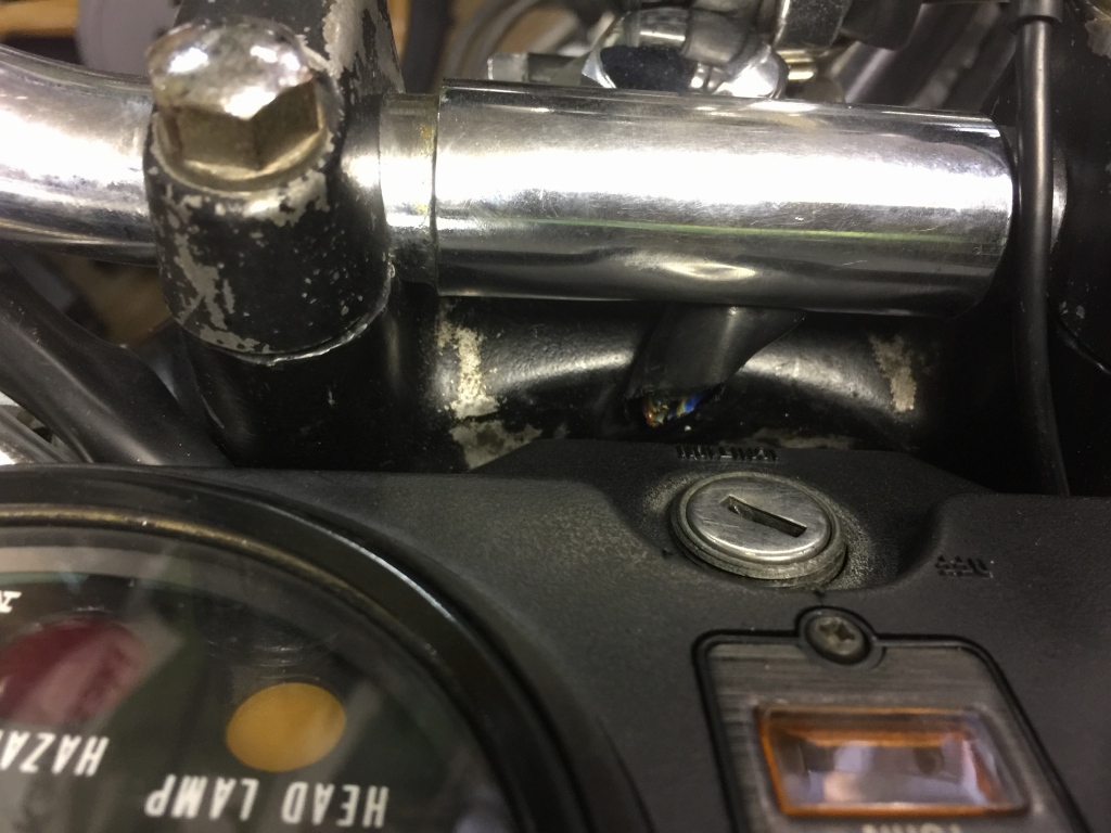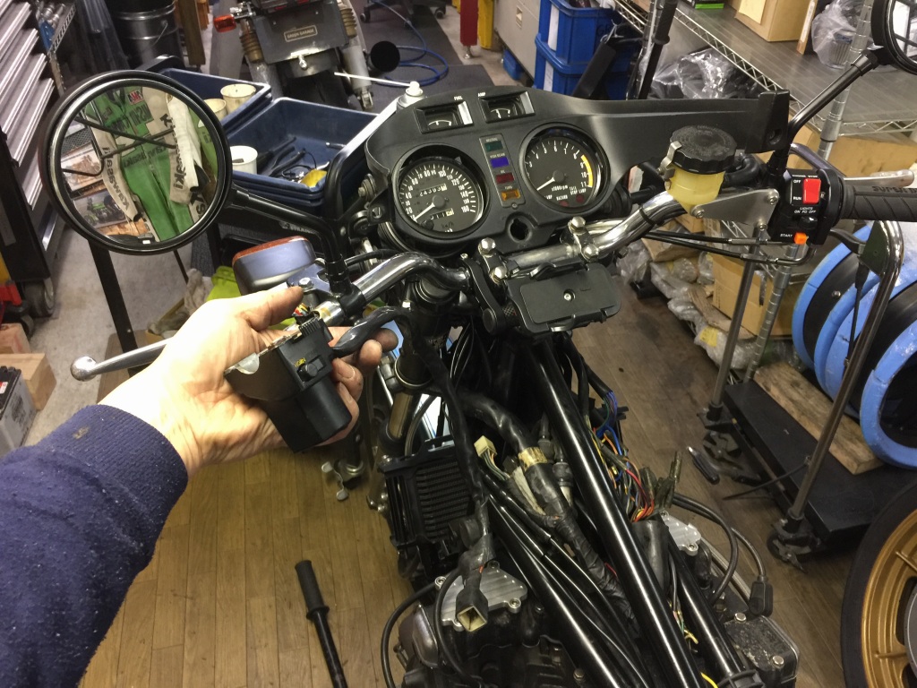ハンドルスイッチを外します。下側半分はハーネスが外部にあるので、メーターカバーを緩めてそのまま抜き取ります。