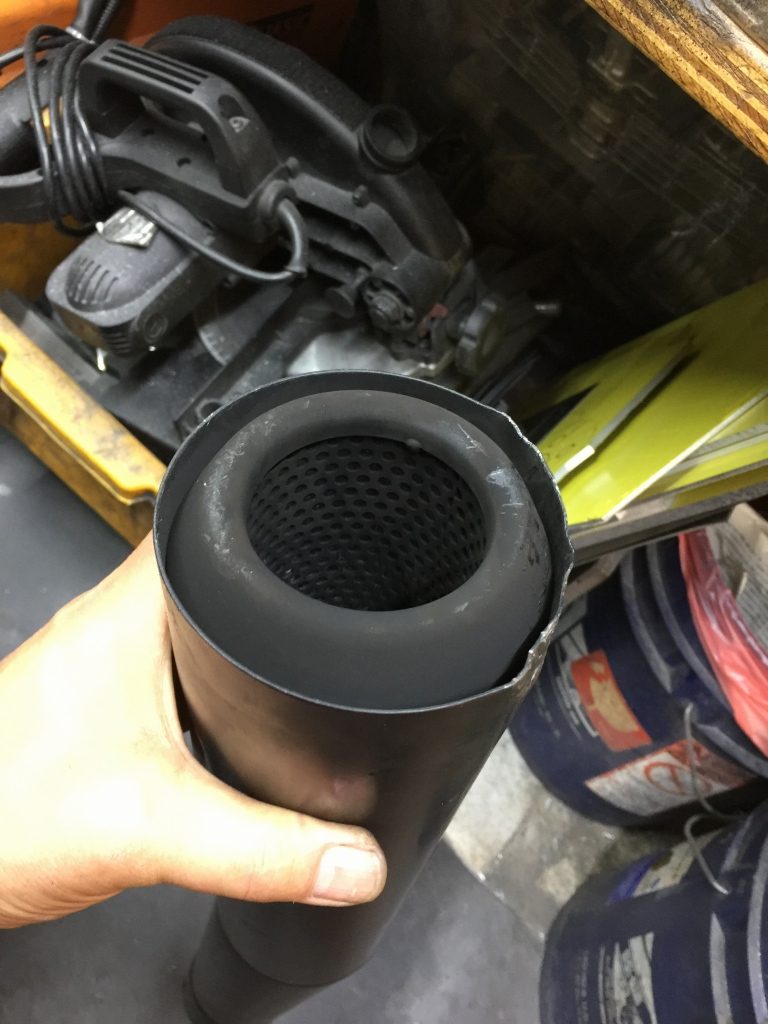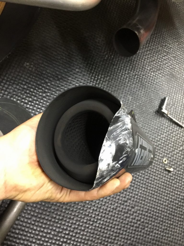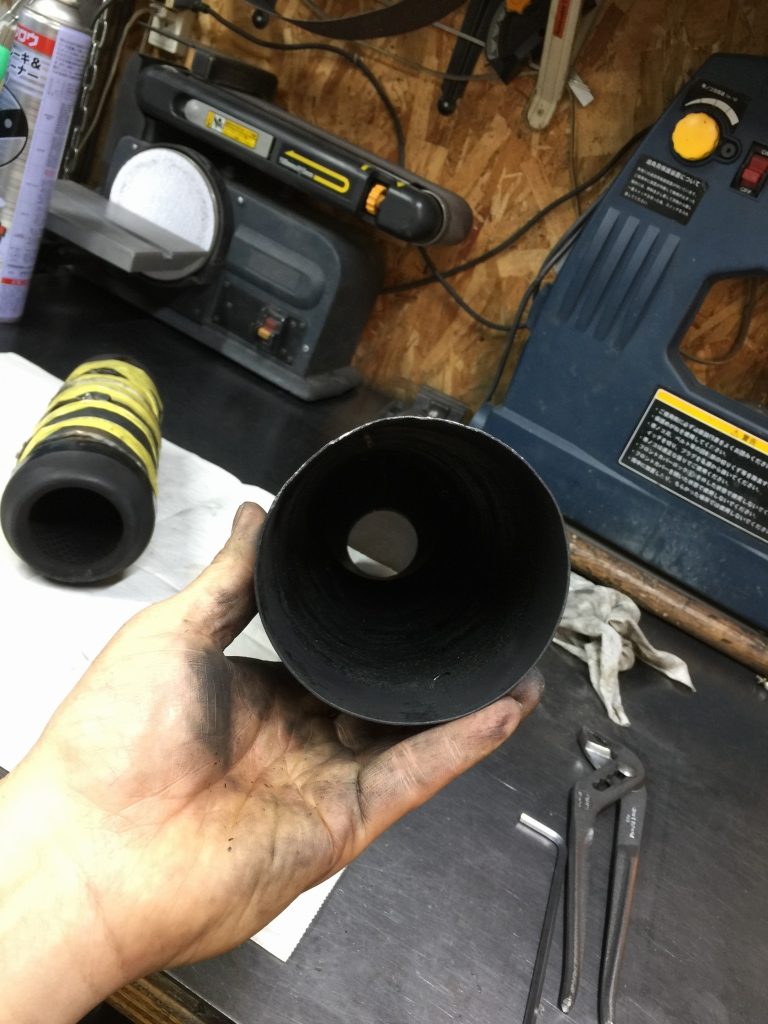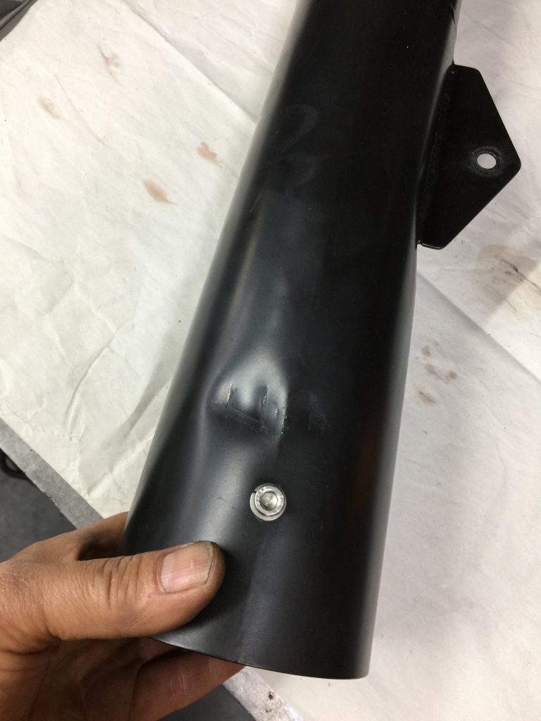 続いてサイレンサー。板金するにはバッフルを抜いて作業したいですが、はたして抜けるでしょうか。