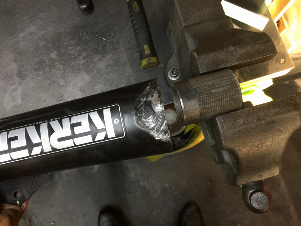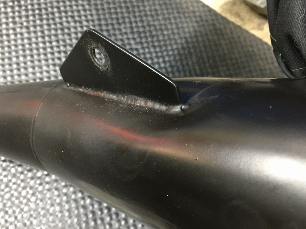 早速修理します。サイレンサーステーは、パイプを差し込んで外側に曲げ直します。