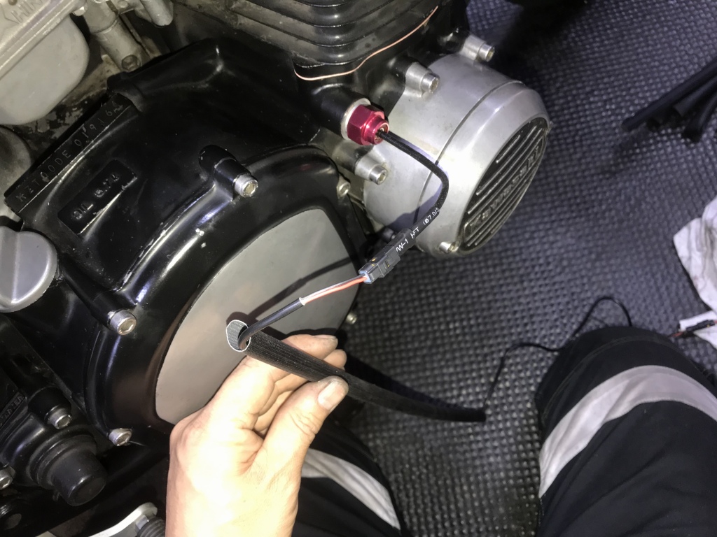 油温センサーのハーネスは、エンジン上を通すので耐熱性の高いガラス編組チューブで保護します。