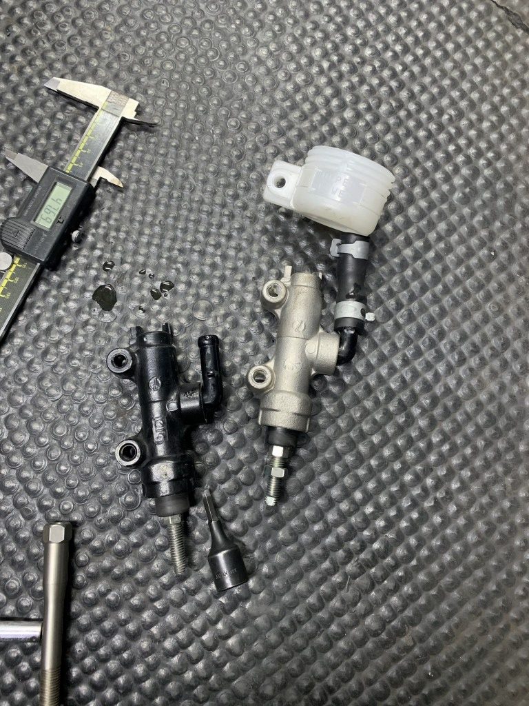 踏み代が多いというリヤマスターも交換することに。現状はピストン径φ1/2インチサイズなので、手持ちのφ14ミリにボアアップします。素材はニンジャ250の純正です。