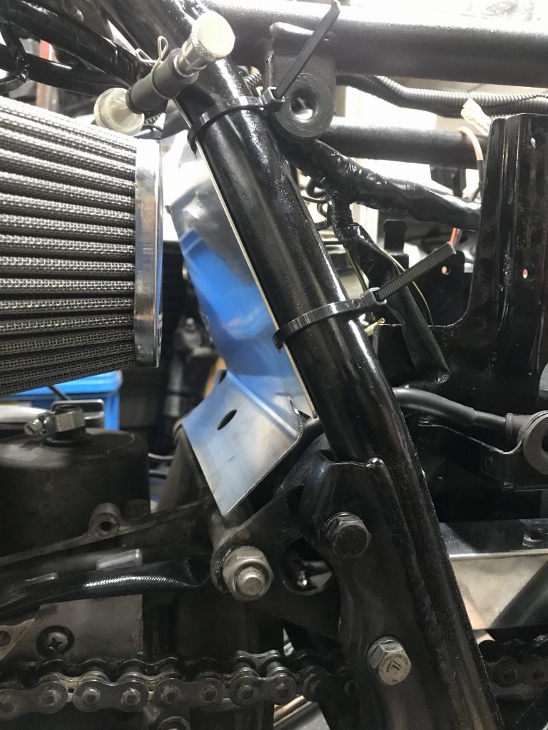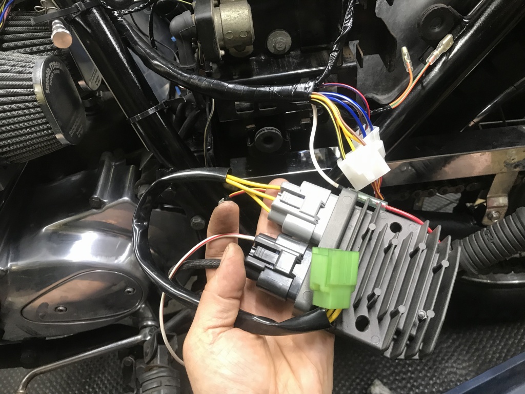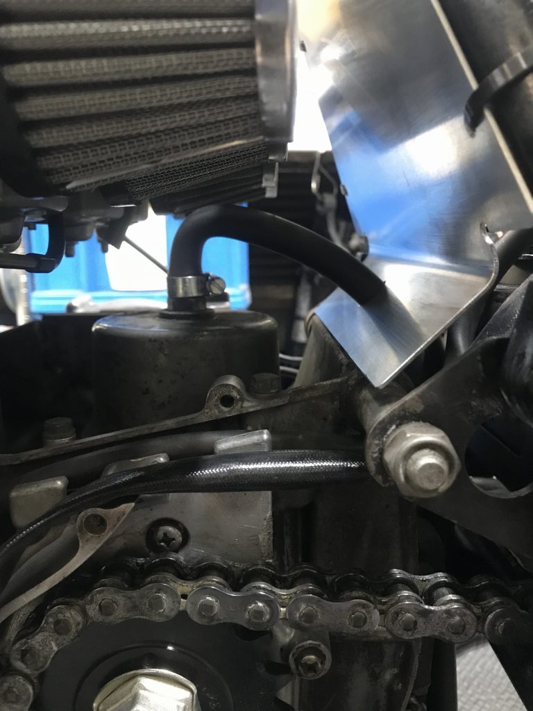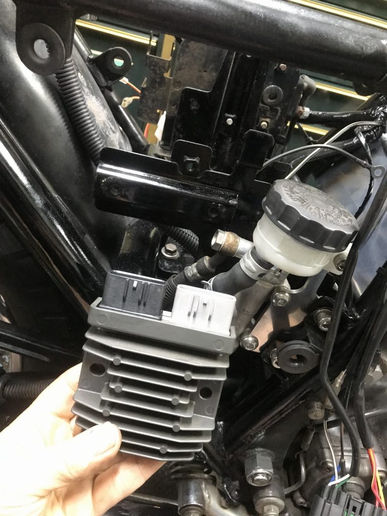 レギュレーターはバッテリー後ろに挟んであったので、右サイドカバー内に移設します。延長されたブレーキホースのバンジョーが干渉するので、ブレーキホースは作り変えます。