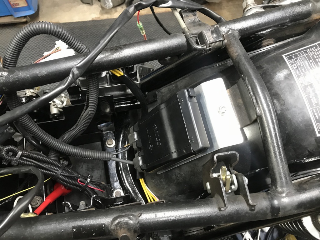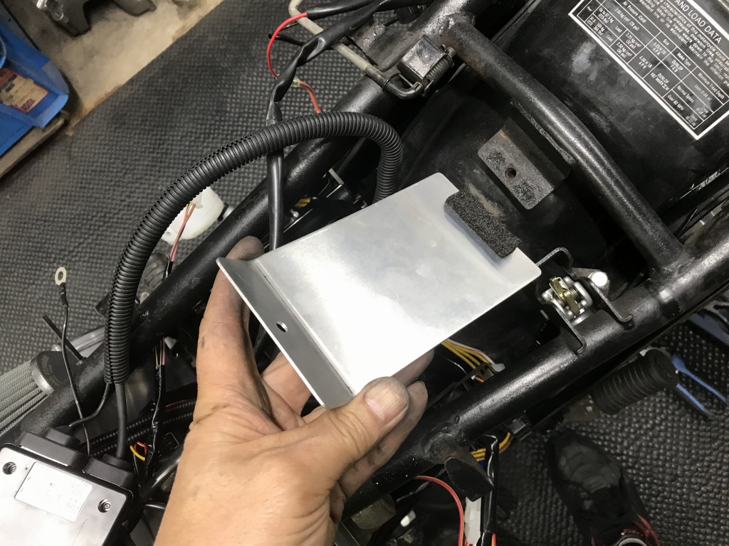テールカウル内にあったETC車載器は、ブラケットを作ってバッテリー後ろへ移設します。