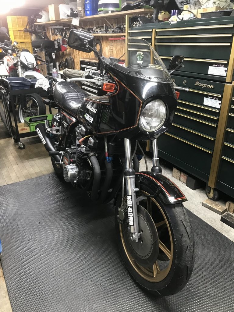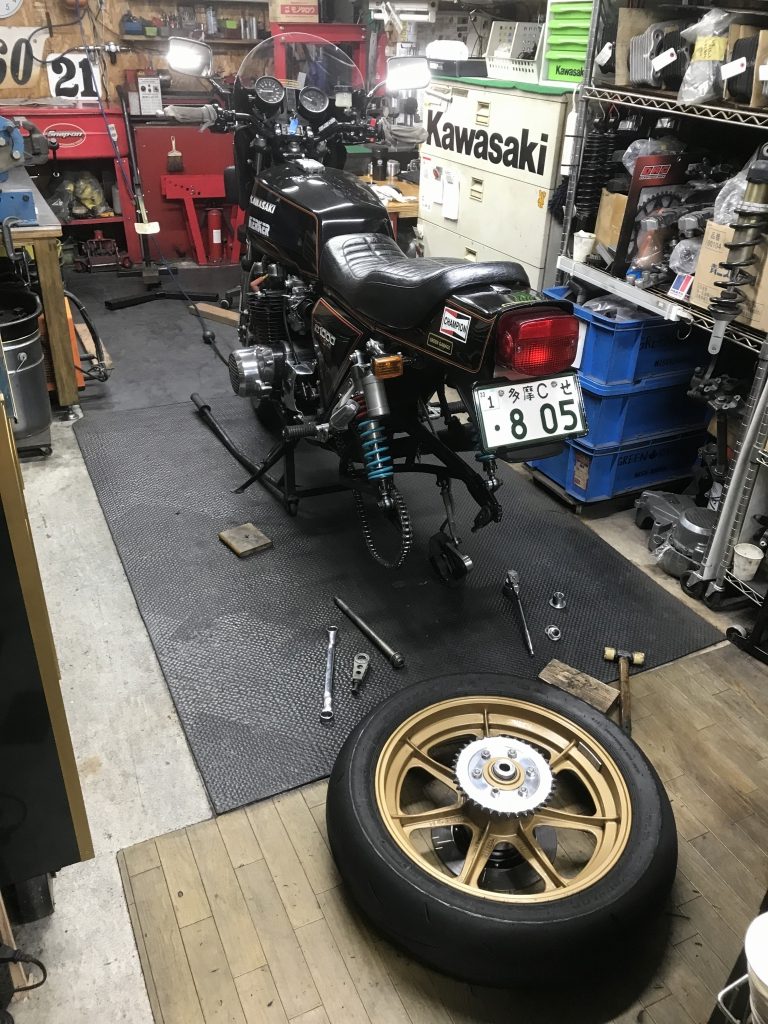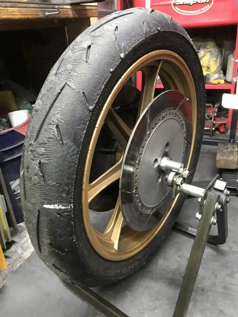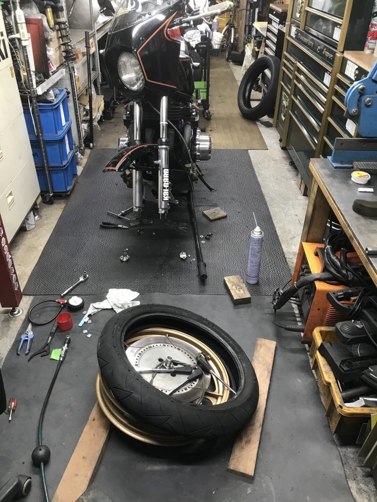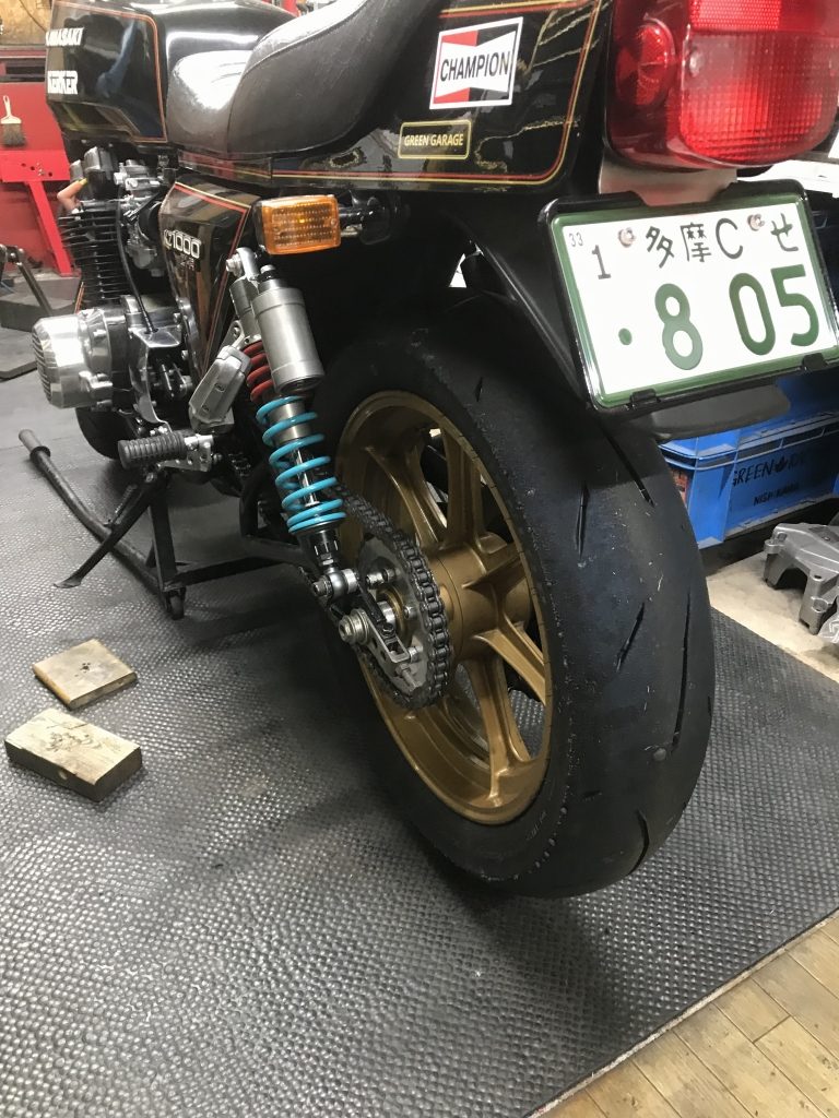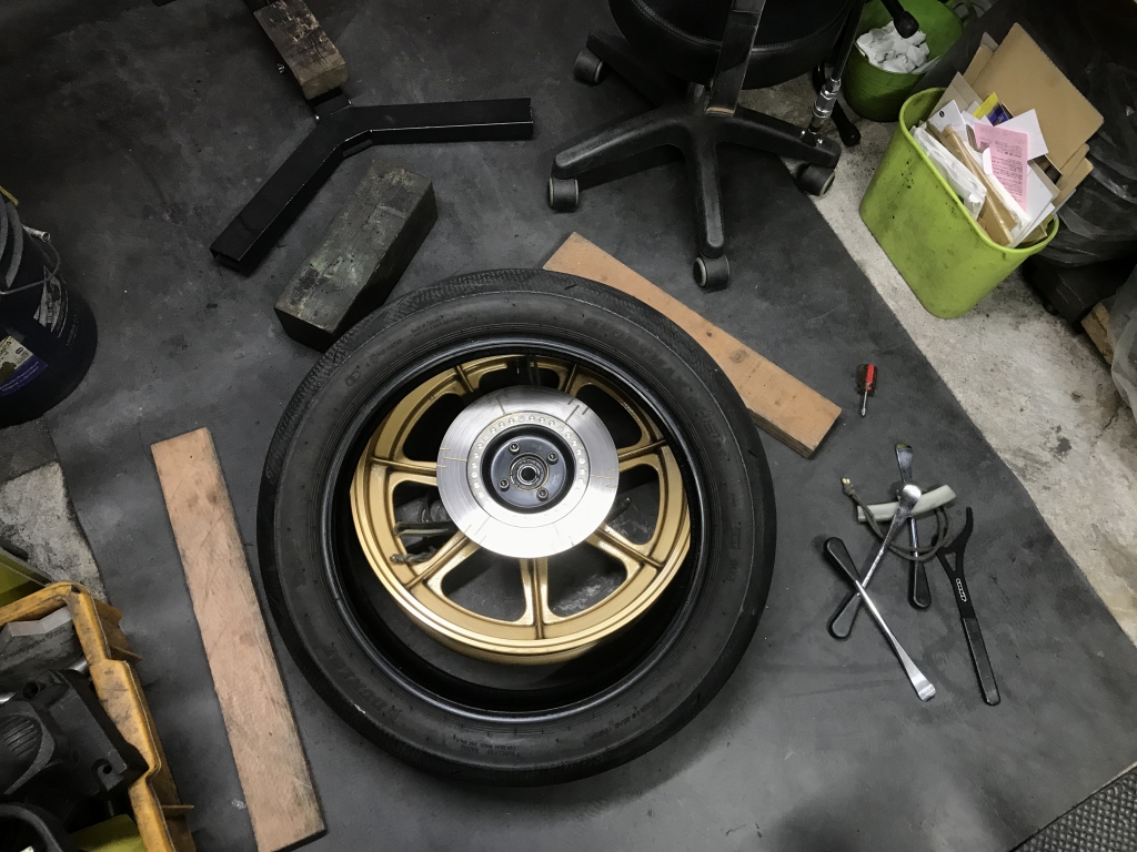 バランス取りして組付けます。タイヤは前回のTOT前に外した1000Jからのお下がりです。サーキットしか走っていないのでセンターは9分山位は残っています。