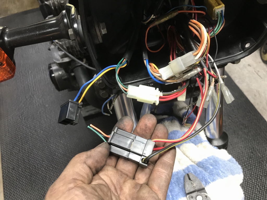 右ハンドルスイッチの接続は、カプラーが異なるのでメインハーネス側に合わせて改造します。