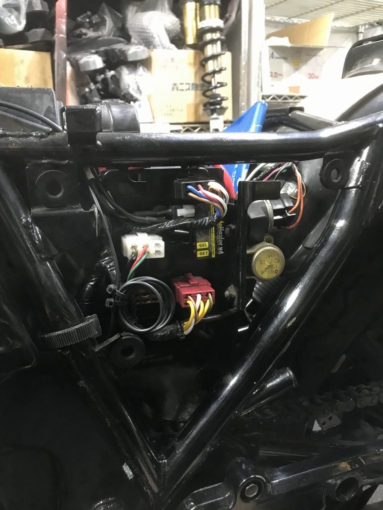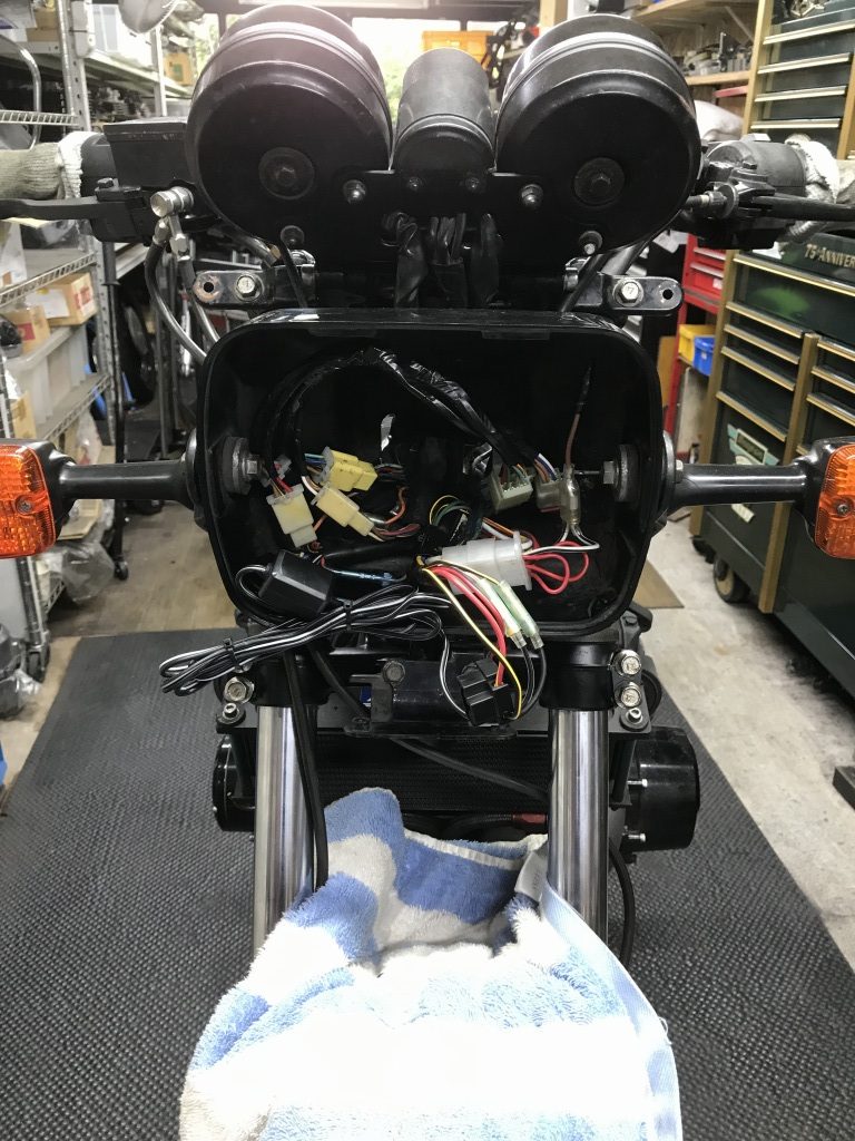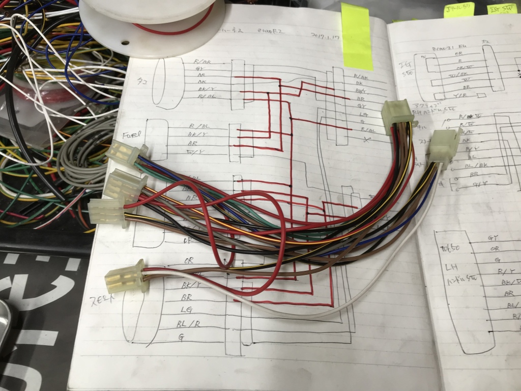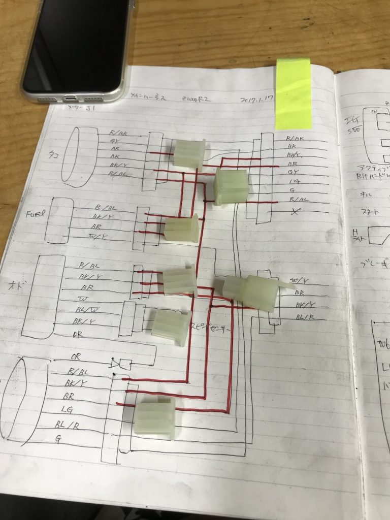 メインハーネスはZ1000-R2なので、丸メーターとの接続はかなりの改造が必要です。今回はアダプターハーネスを製作することに。