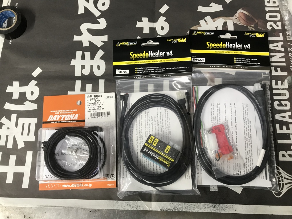 続いてスピードセンサーを製作します。材料はこちら。センサーはデイトナ製の非接触タイプを使用。その信号をスピードヒーラーで補正する構成です。