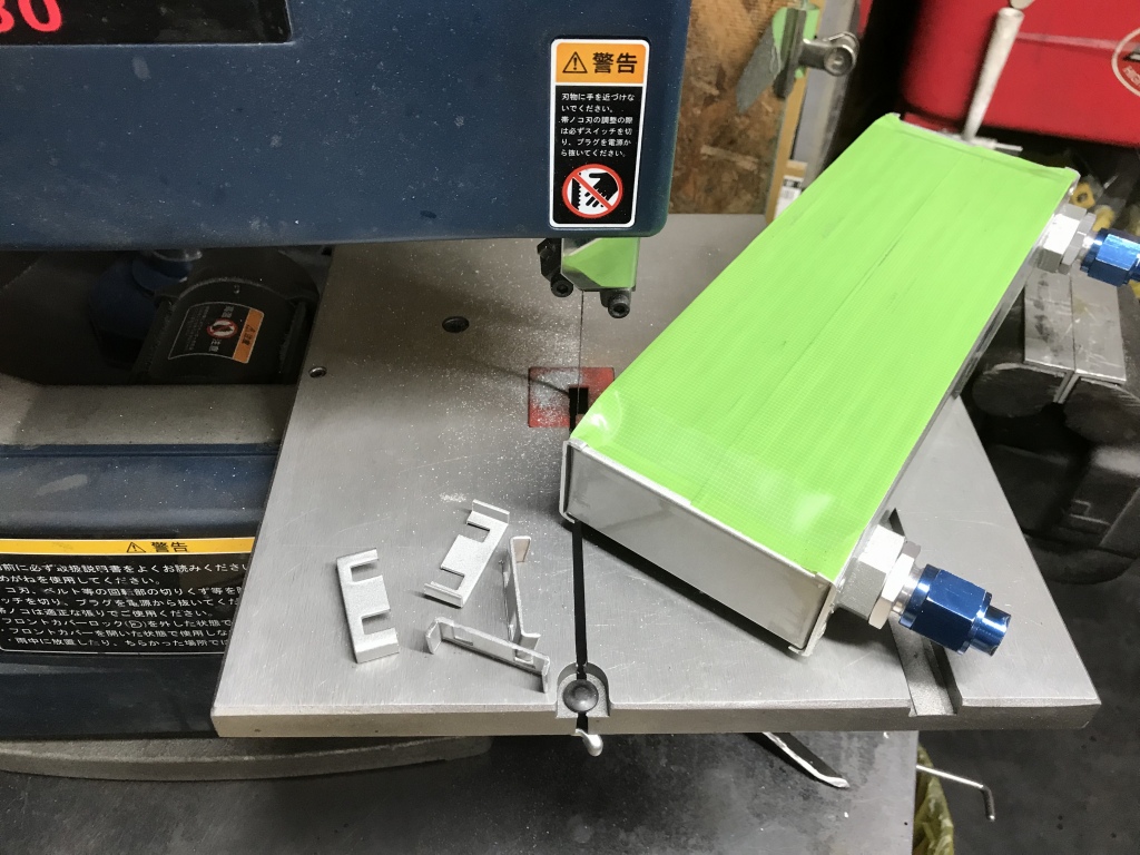 バンドソーで切り出し、オイル通路を完成させます。