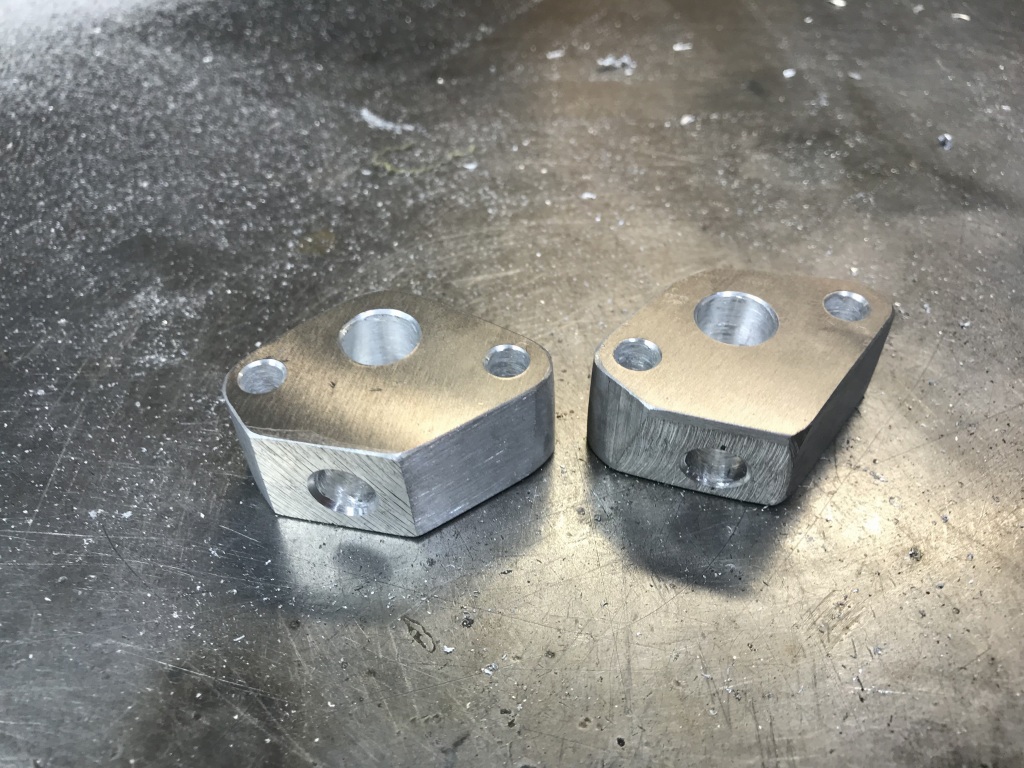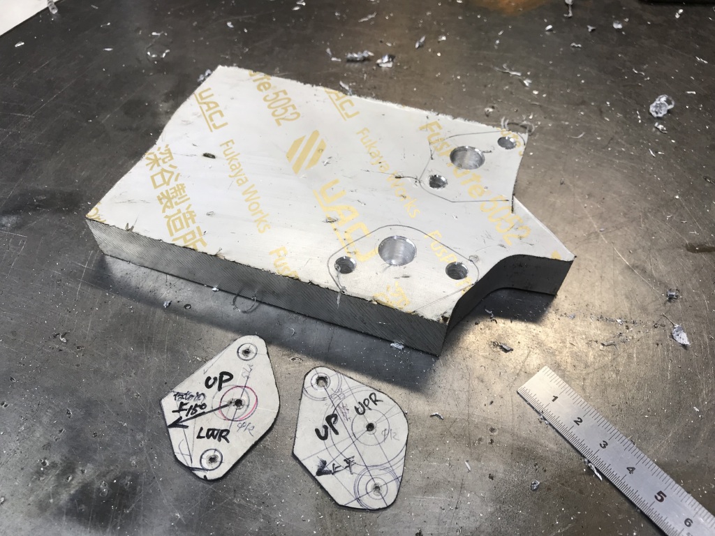 続いてオイル取出しを製作します。アルミの厚板にマーキングし、必要な穴開けをします。