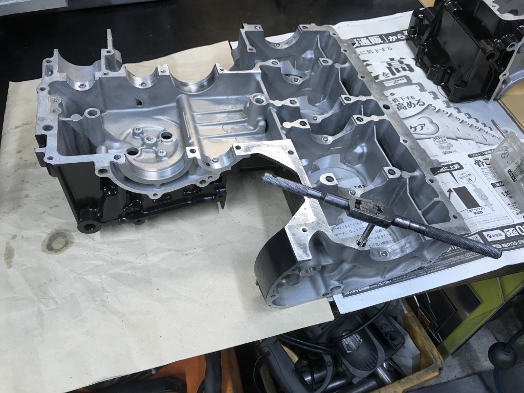 ケースのネジ穴は、ブラストのメディアなどが残っていないか、全てにタップを立ててチェックします。