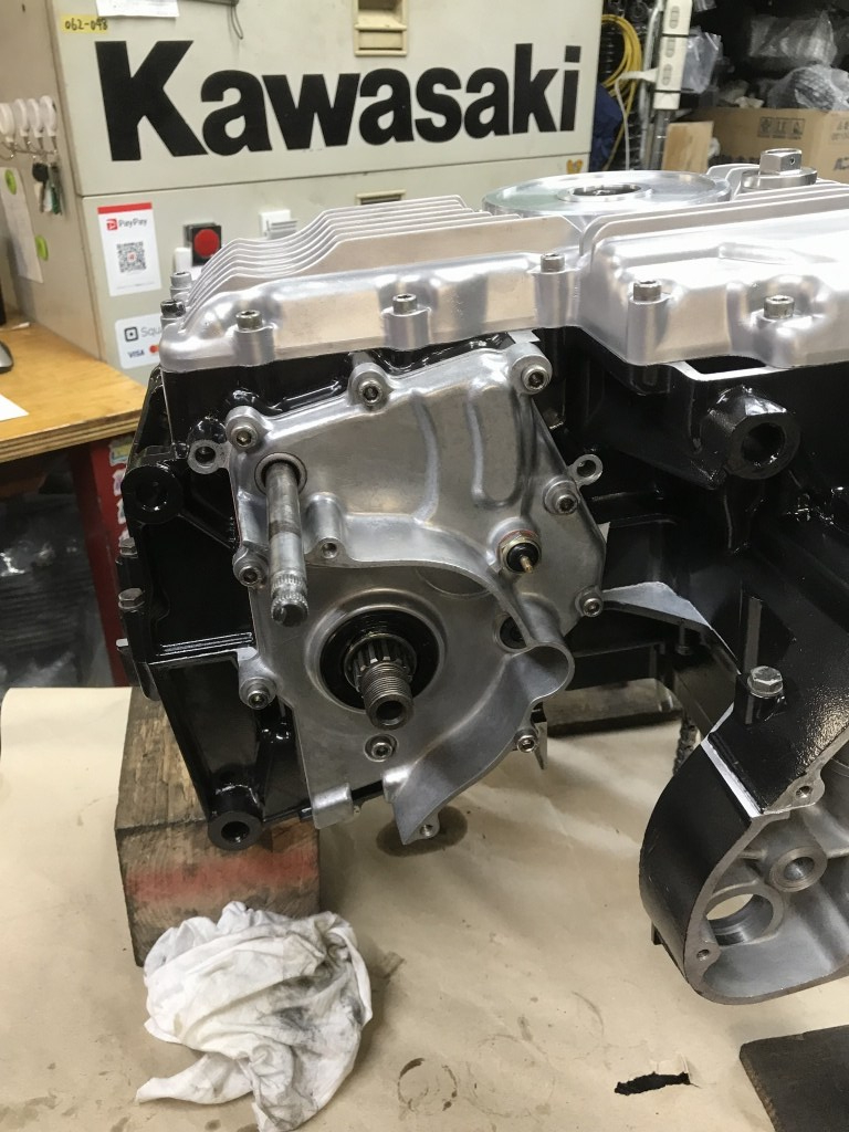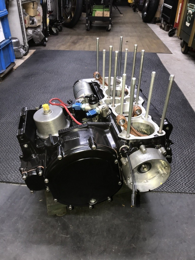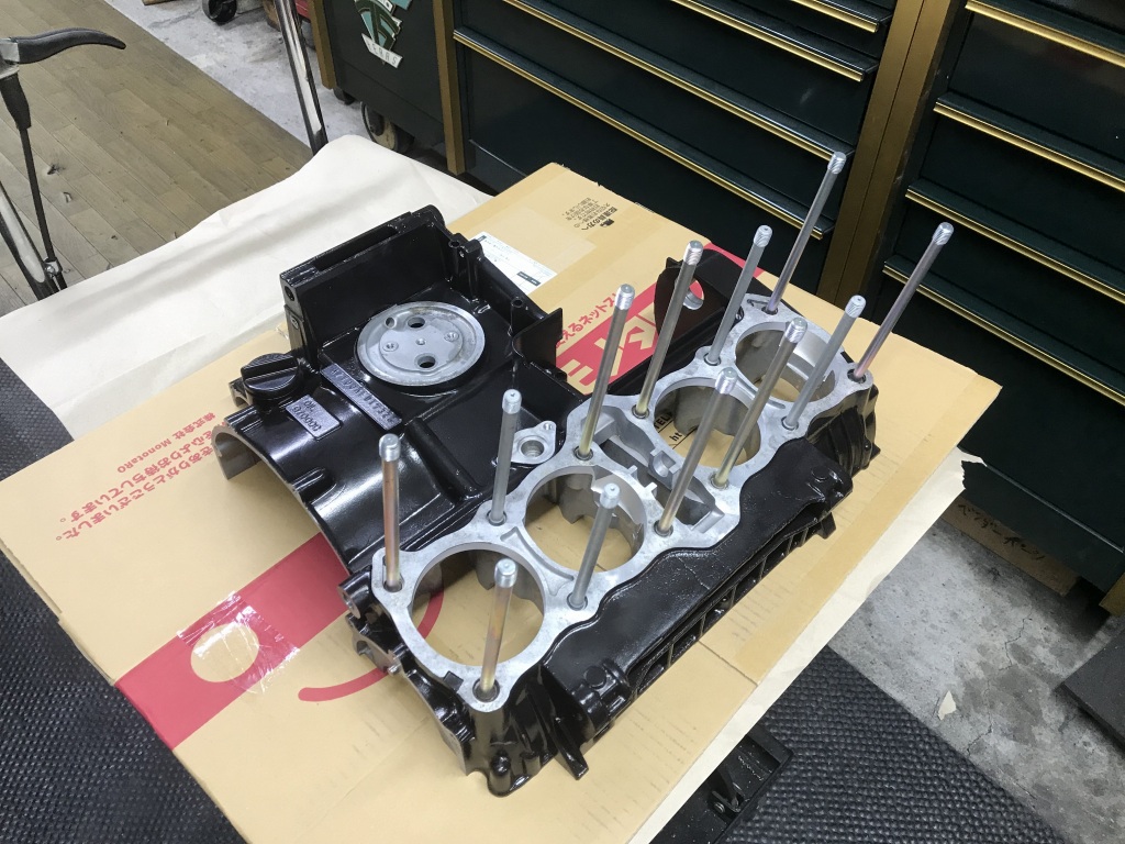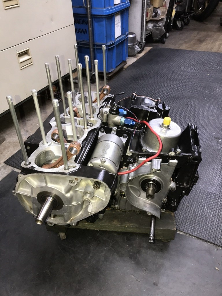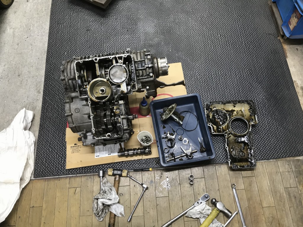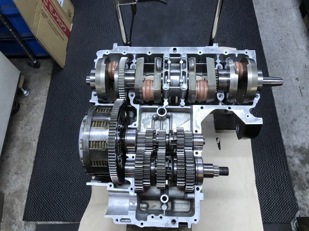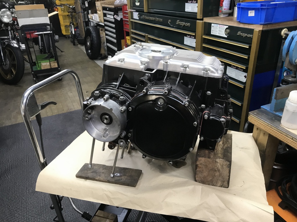 部品が揃ったので4か月ぶりにエンジンの組み立てを開始します。クランクケースはミッションベアリングの締め付けが緩くなっていたので、別の程度のいいケースに交換し、セラコートで塗装しました。