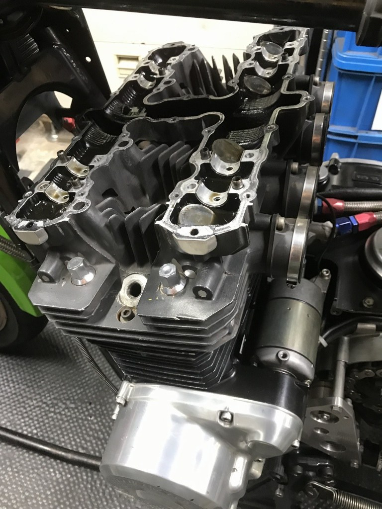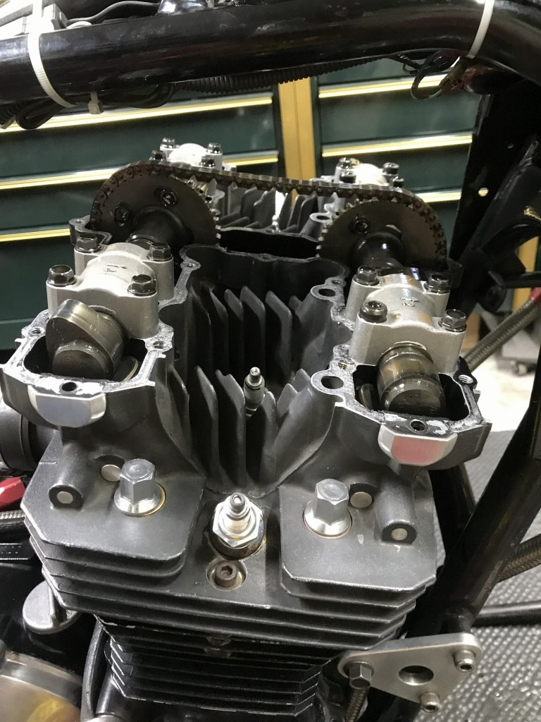 ヘッドカバーを外します。現在のピストンとカムの仕様は、3年前から使用しているもので、途中、何回か腰上は分解整備しています。ヘッドやその他の主要パーツは20年来、修理しながら使用しているものです。