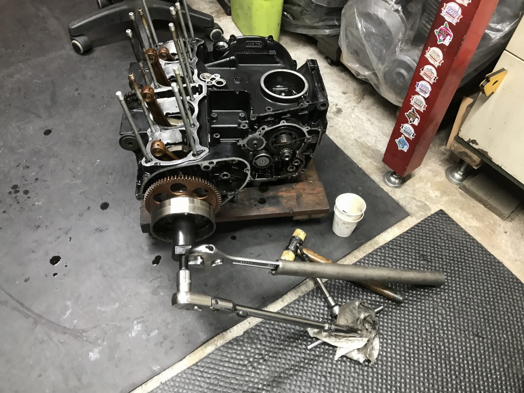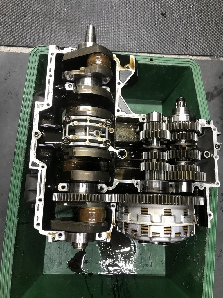 クランクを回してみると、少し引っかかりを感じるので、念のため腰下も分解点検することに。