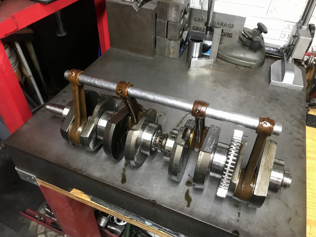 クランクを外して点検します。点検棒はスルリと通ります。このクランクはGPZ1100用で、コンロッド小端部にブッシュを入れてφ17ミリに小径化したものを中古で入手して使用しています。