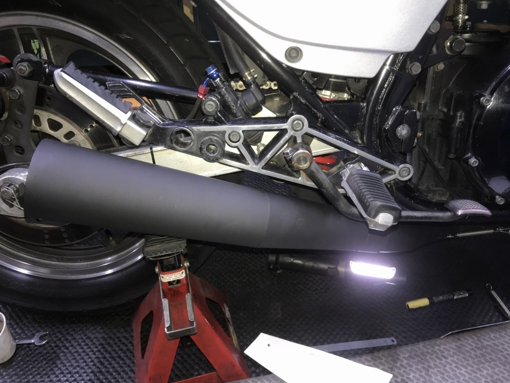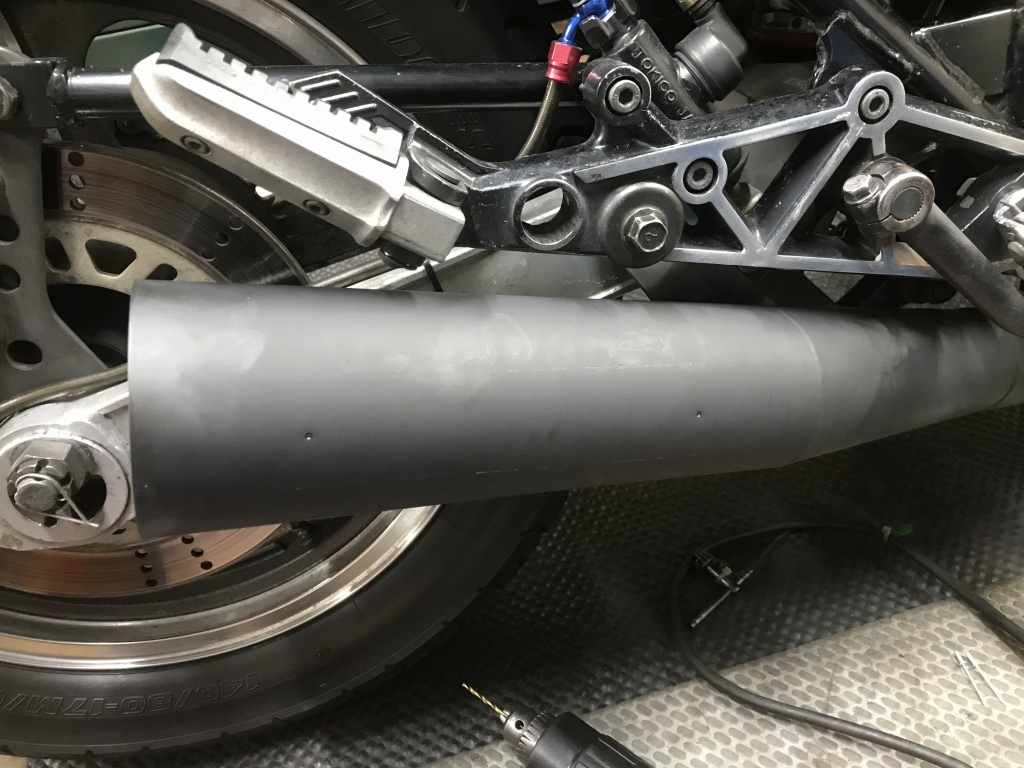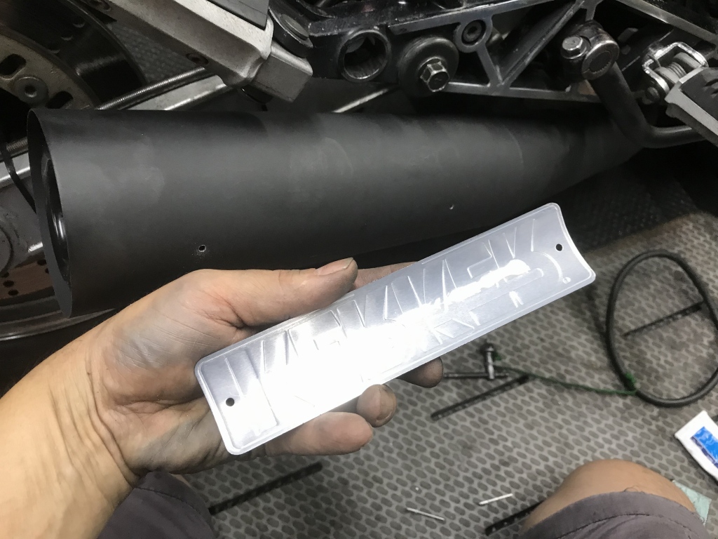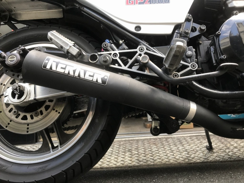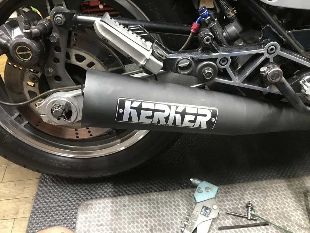 マフラー取り付けのご依頼です。現在はKERKERのK2ですが、エキパイがエンジン下でS字カーブしているタイプ。