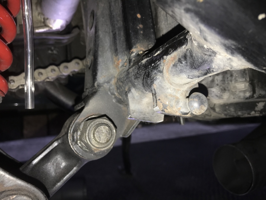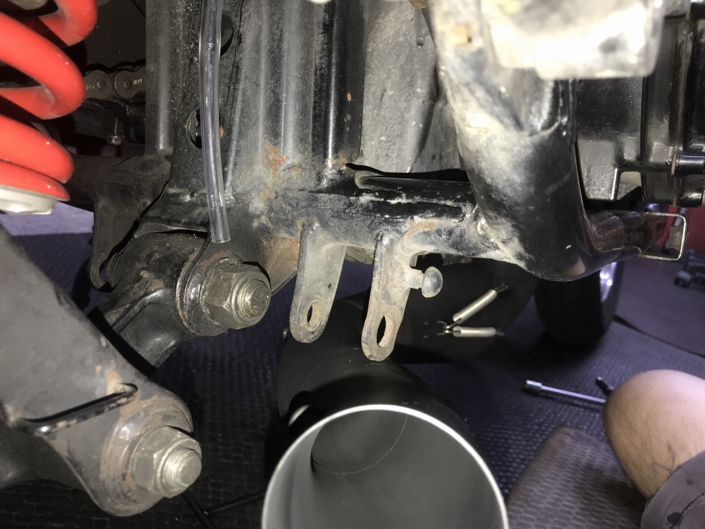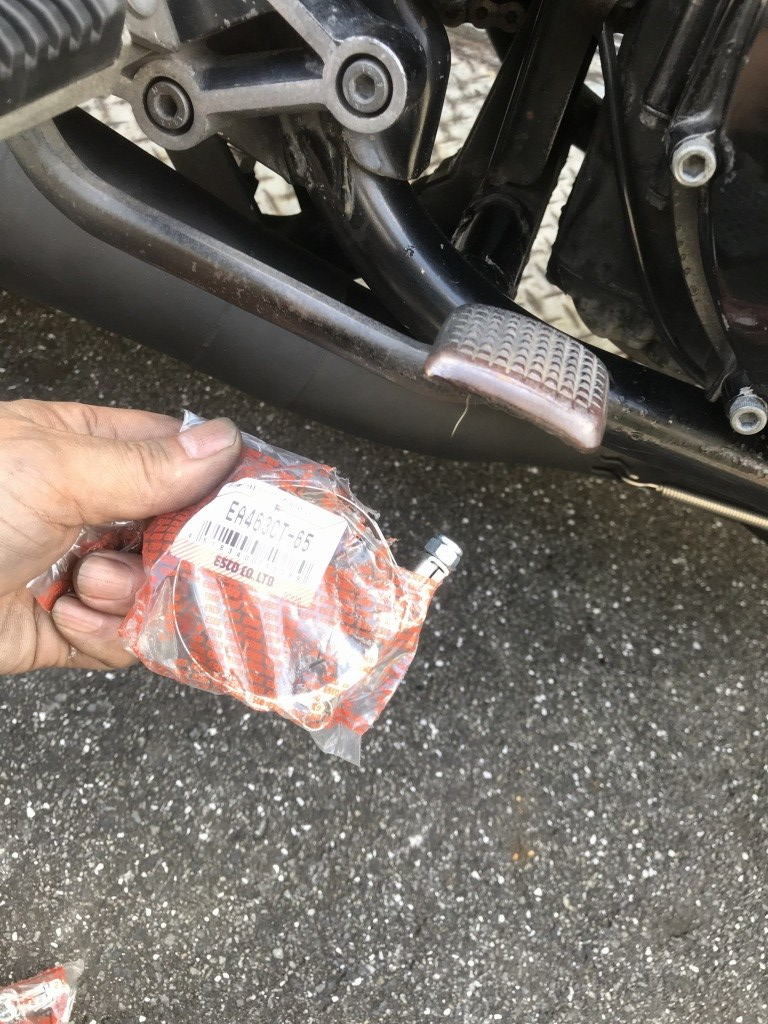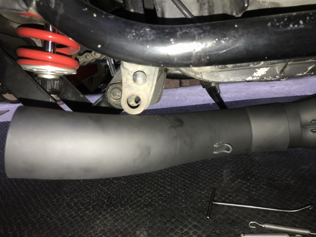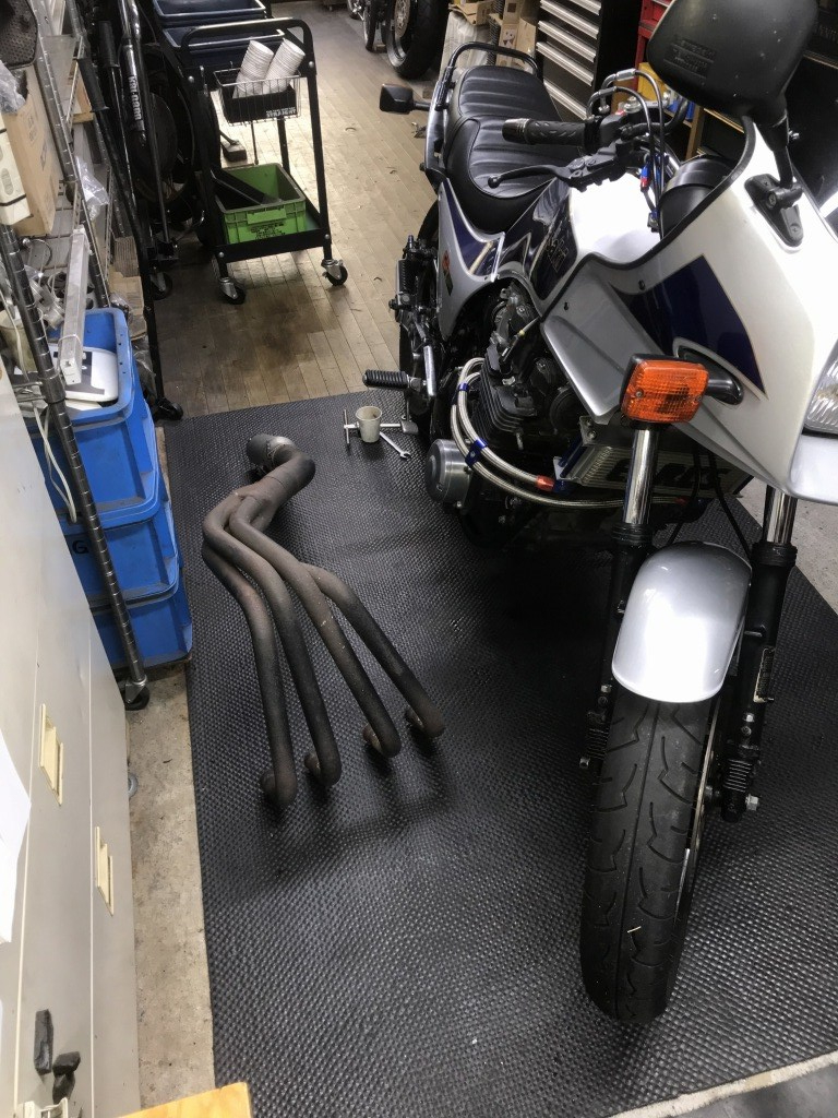 マフラー取り付けのご依頼です。現在はKERKERのK2ですが、エキパイがエンジン下でS字カーブしているタイプ。