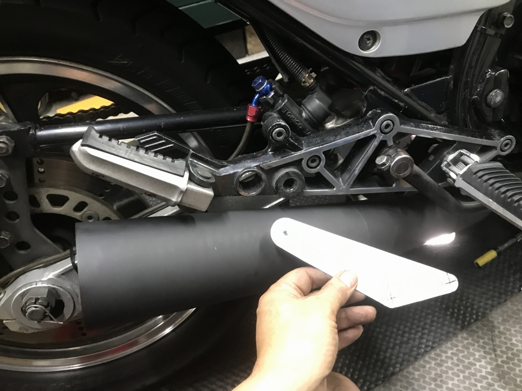 GPZ用のステーは無いので、現車合わせで製作します。先ずは厚紙で型を作ります。
