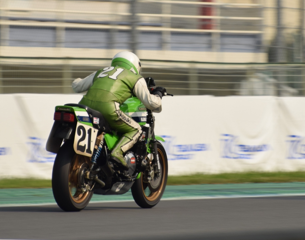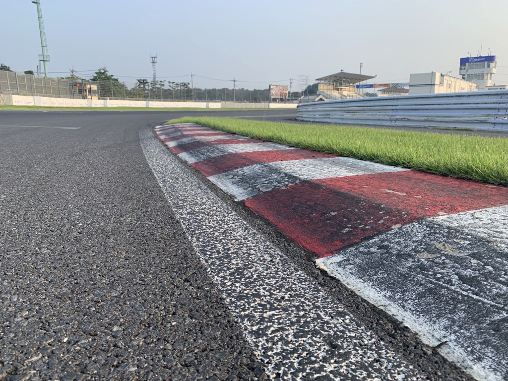 そして、ホームストレートアウト側縁石までいっぱいにコースを使いスピードを乗せていきます。縁石は低く割とフラットなので、乗り上げてもアクセル全開で行けます。