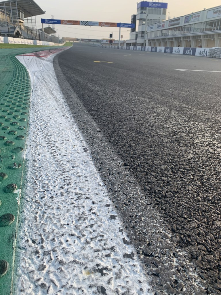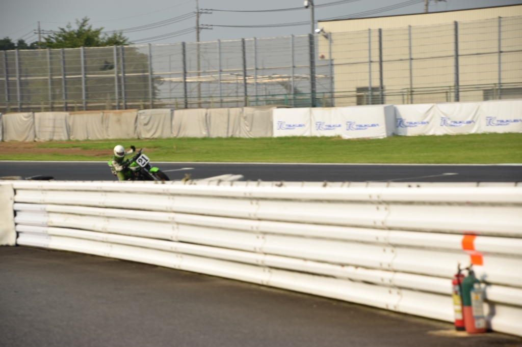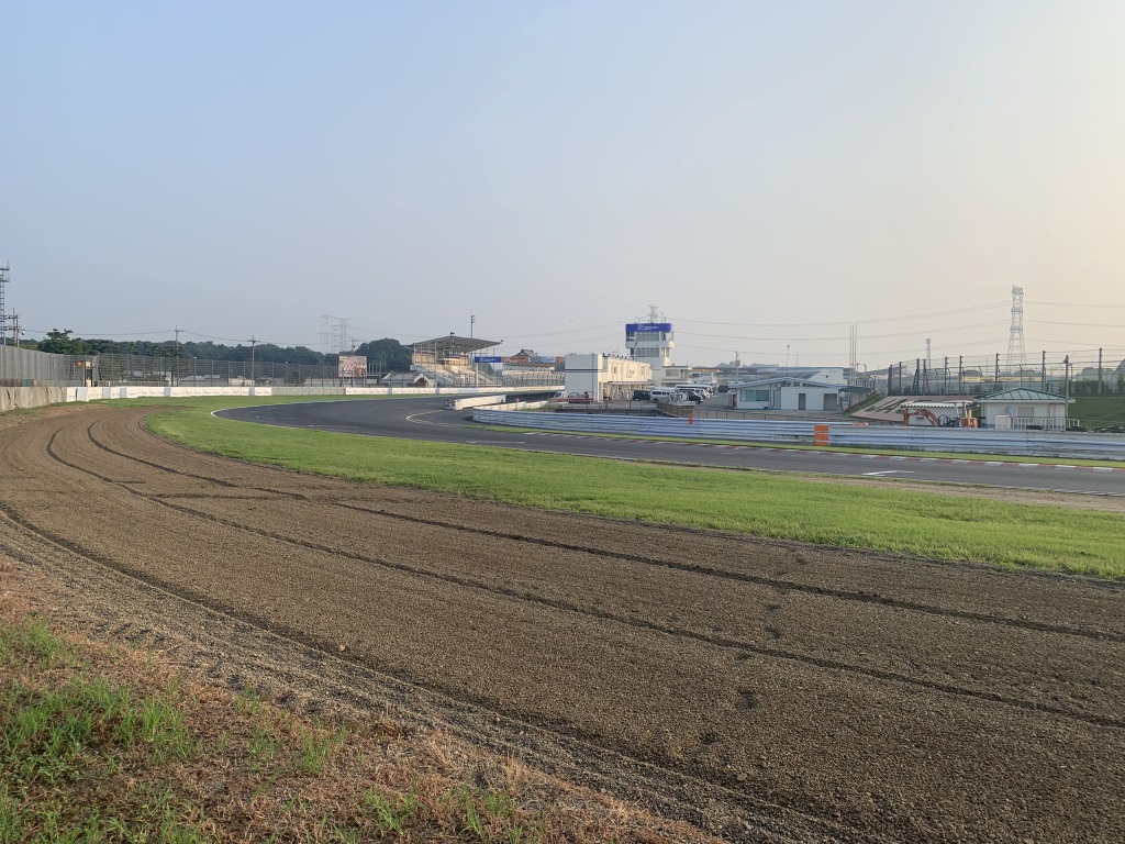 コースオープン前、歩いてコースの下見をします。あらためて最終コーナーをじっくり観察。ここは最終コーナー入口からバックストレートを望む位置です。グラベルが幅広くあるので、転倒してもケガはし難い場所なので思い切り突っ込めます。